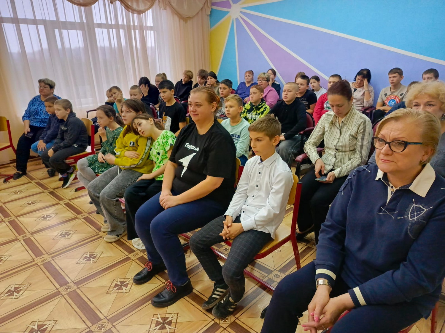 В начале встречи Юрий Владимирович поблагодарил учеников, учителей, жителей деревни Веселёво за сотрудничество с Годуновским отделом Конвоя и Столичной сотней в сборе гуманитарной помощи и показал видеоролик с благодарностью бойцов ученикам и учителям Веселевской школы.