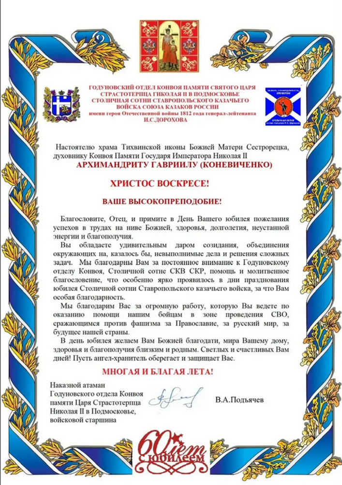12 апреля 2026 года. Поздравление с Юбилеем – 60-летием настоятелю храма Тихвинской иконы Божией Матери Сестрорецка, духовнику Конвоя Памяти Государя Императора Николая II архимандриту Гавриилу (Коневиченко) от казаков Годуновского отдела Конвоя в Подмосковье и Столичной сотни СКВ СКР
