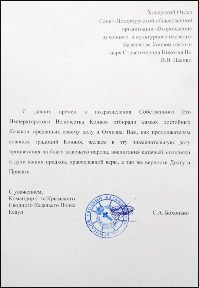 Поздравление Хоперского отдела Конвоя Памяти Государя Императора Николая II с Юбилеем Конвоя от командира 1-го Крымского Сводного Казачьего Полка есаула С.А.Бохонько