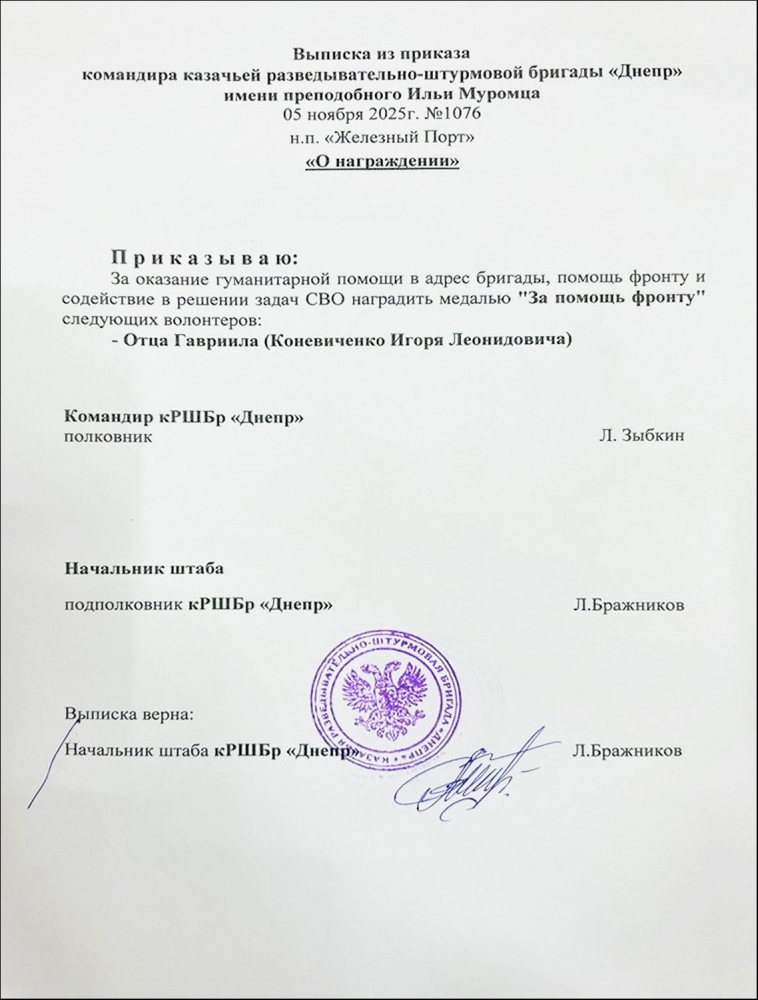 Приказом командира казачьей разведывательно-штурмовой бригады «Днепр» №1076 от 05 ноября 2025 года настоятель храма Тихвинской иконы Божией Матери города Сестрорецка, духовник Батальона Цесаревича Алексия архимандрит Гавриил (Игорь Леонидович Коневиченко) награжден медалью «За помощь фронту».