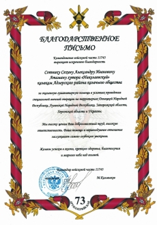 Благодарственное письмо от командира войсковой части 11743