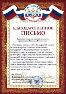 Благодарность духовнику батальона Цесаревича Алексия архимандриту Гавриилу (Коневиченко) от Ленинградской региональной общественной организации «Ассоциация ветеранов СВО»
