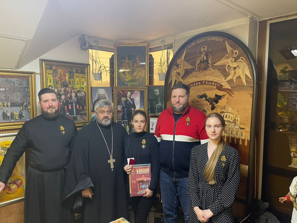 За верноподданнические чувства и любовь к Государю архимандрит Гавриил (Коневиченко) наградил орденским знаком «Император Николай II» иерея Илию Нефедова, Войтова Юрия Владимировича, Тадич Даниелу, Безуглову Кристину и вручил им альманах «Конвой», изданный к 100-летию мученического подвига Царской Семьи,
