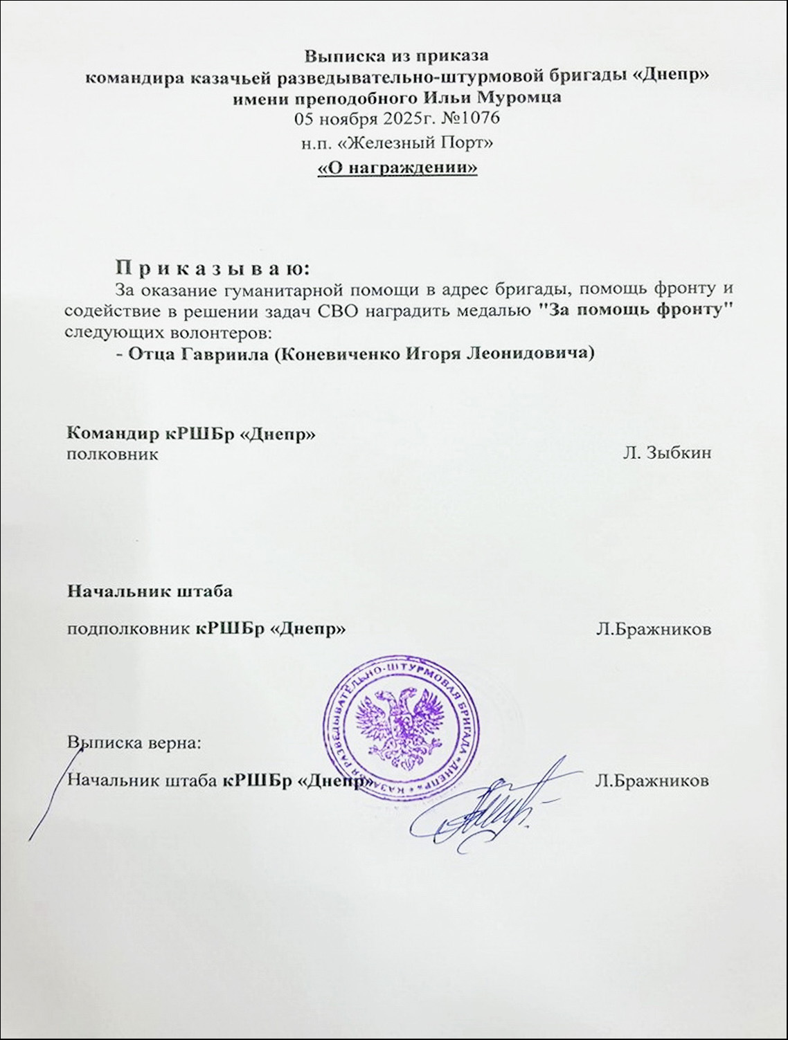 Приказом командира казачьей разведывательно-штурмовой бригады «Днепр» №1076 от 05 ноября 2025 года настоятель храма Тихвинской иконы Божией Матери города Сестрорецка, духовник Батальона Цесаревича Алексия архимандрит Гавриил (Игорь Леонидович Коневиченко) награжден медалью «За помощь фронту».