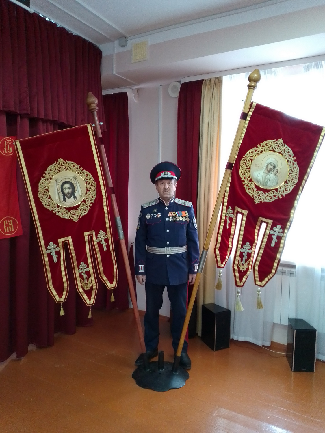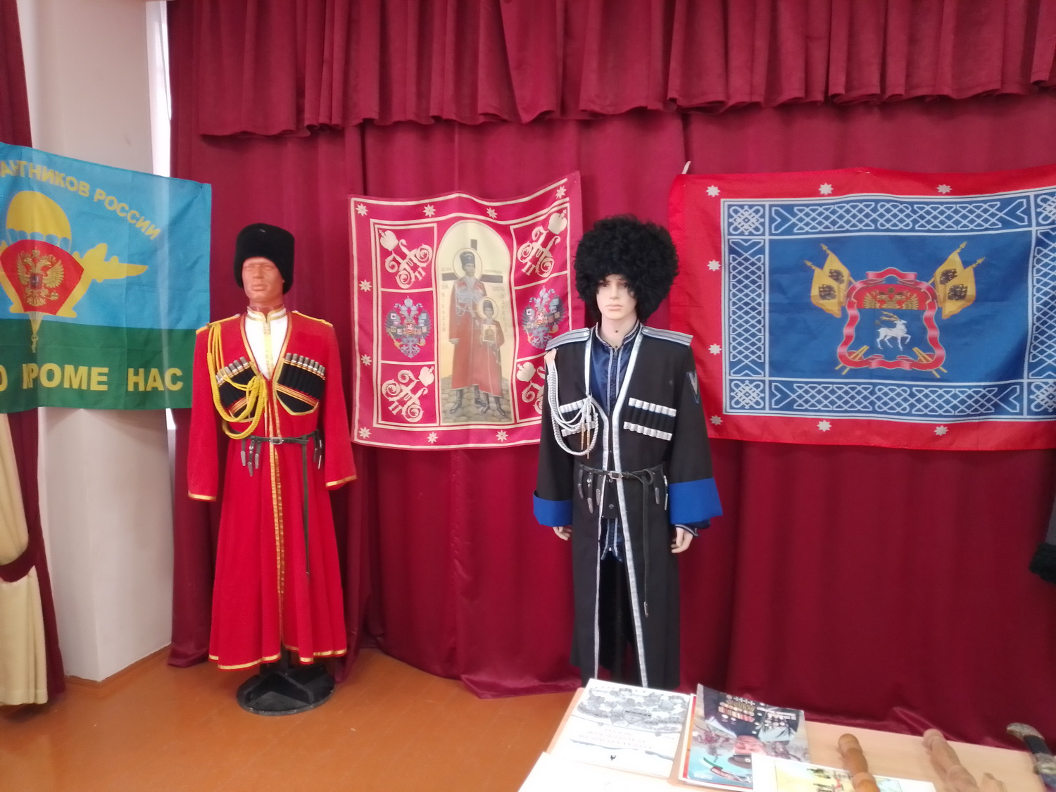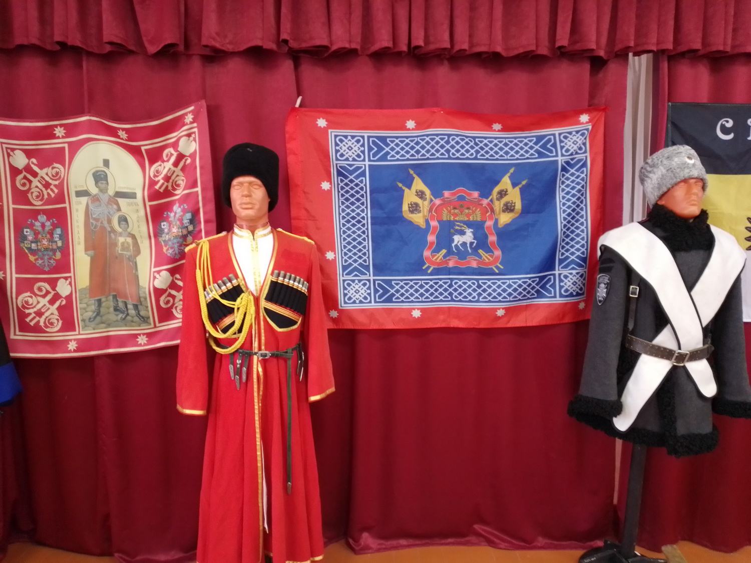 Для ознакомления были наглядно представлены манекены в казачьей справе разных казачьих войск и казачьи святыни штандарт Конвоя и хоругви с изображением святых.