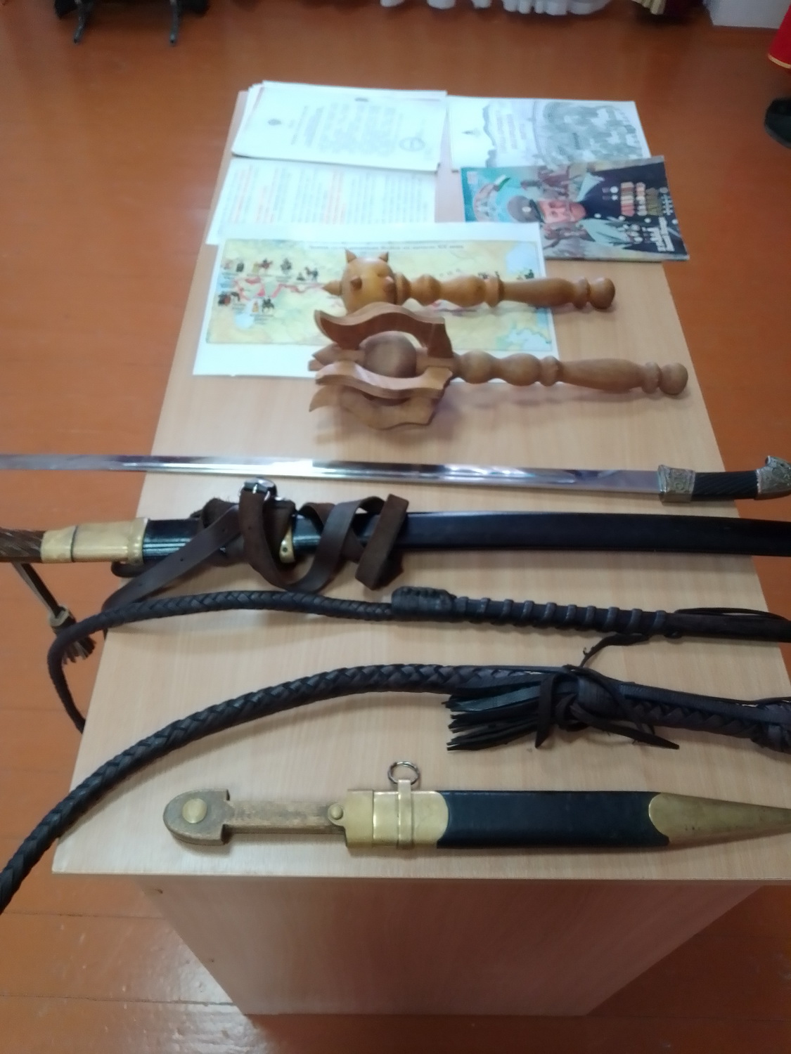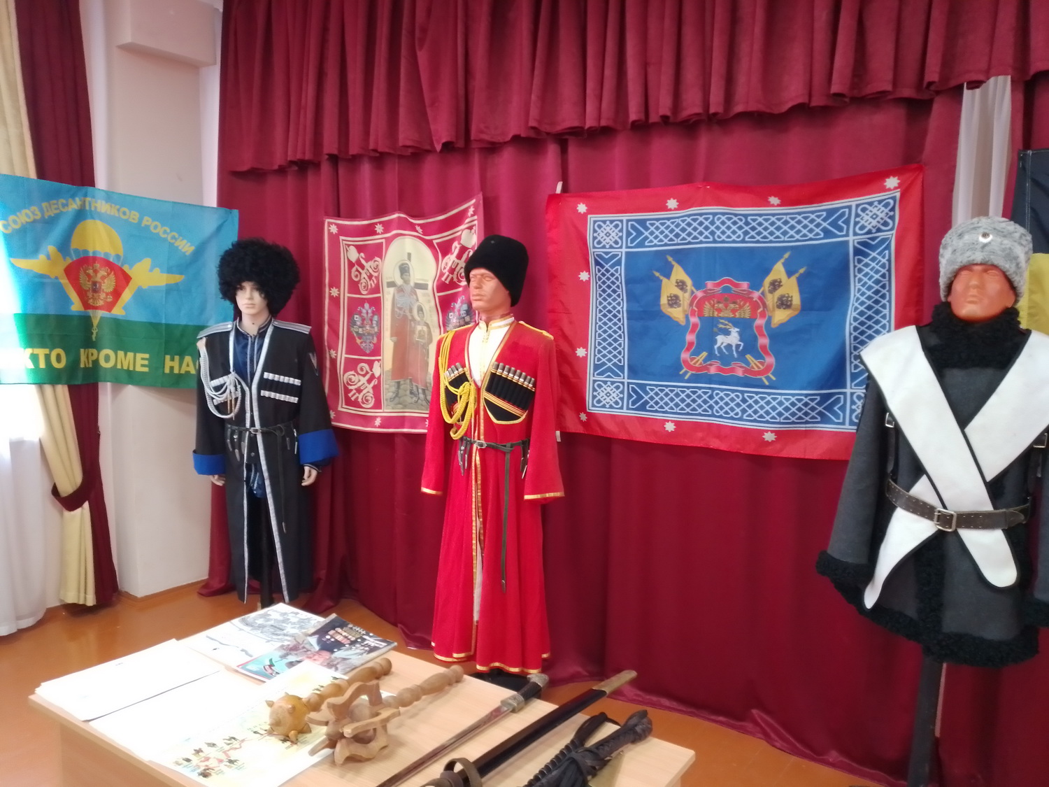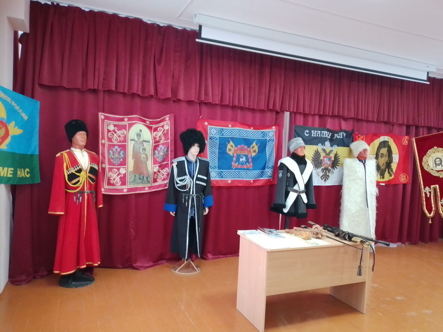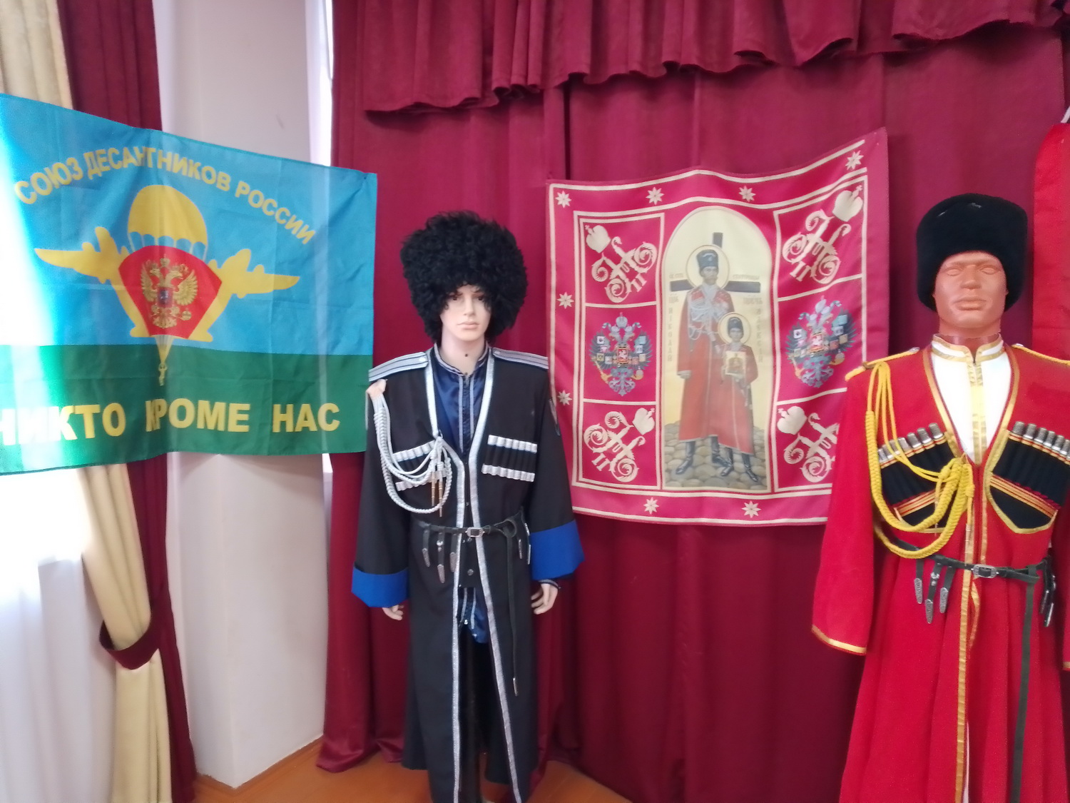Для ознакомления были наглядно представлены манекены в казачьей справе разных казачьих войск и казачьи святыни штандарт Конвоя и хоругви с изображением святых.