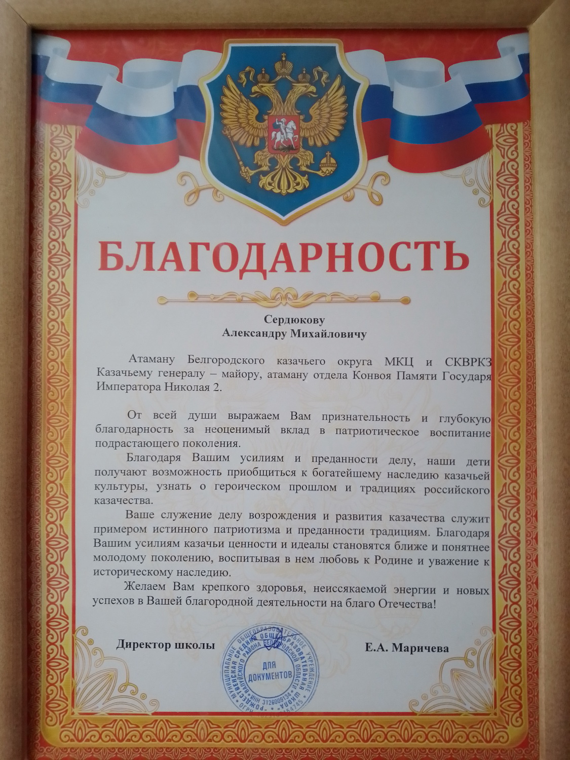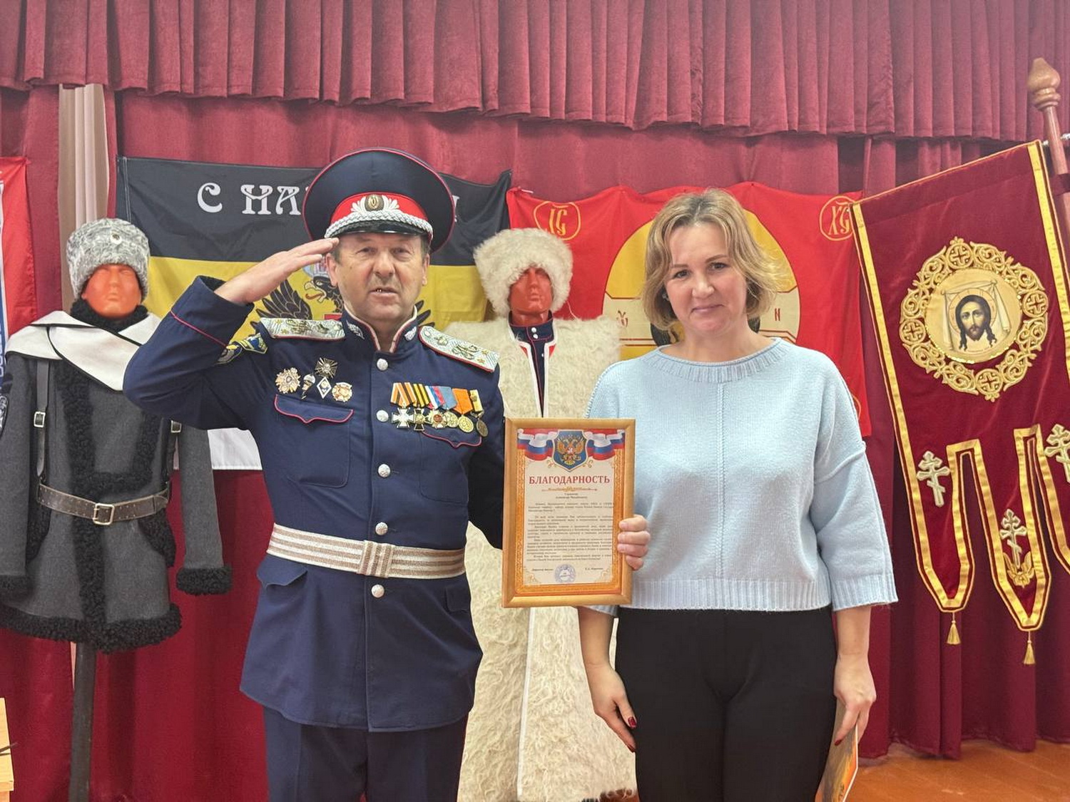 В заключение стороны заверили друг друга в продолжении сотрудничества, а директор школы Е.А. Маричева вручила благодарность атаману А.М. Сердюкову за проведение работы в историко-патриотическом направлении.