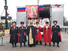 По традиции настоятель храма Тихвинской иконы Божией Матери города Сестрорецка, духовник казачьей общины «Невская сечь» архимандрит Гавриил (Коневиченко) совершил молитву и окропил святой водой гуманитарную помощь и колесницу, которая отправилась в Донецкую Народную Республику.