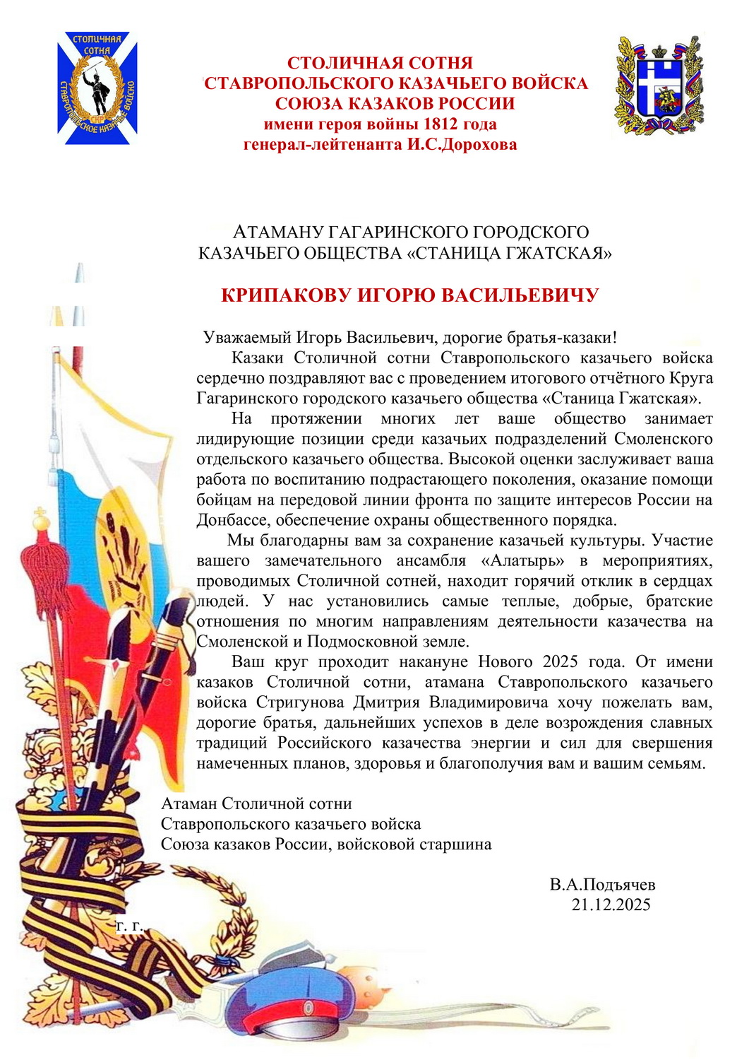21 декабря 2025 года прошел итоговый отчетный Круг Гагаринского городского казачьего общества «Станица Гжатская»