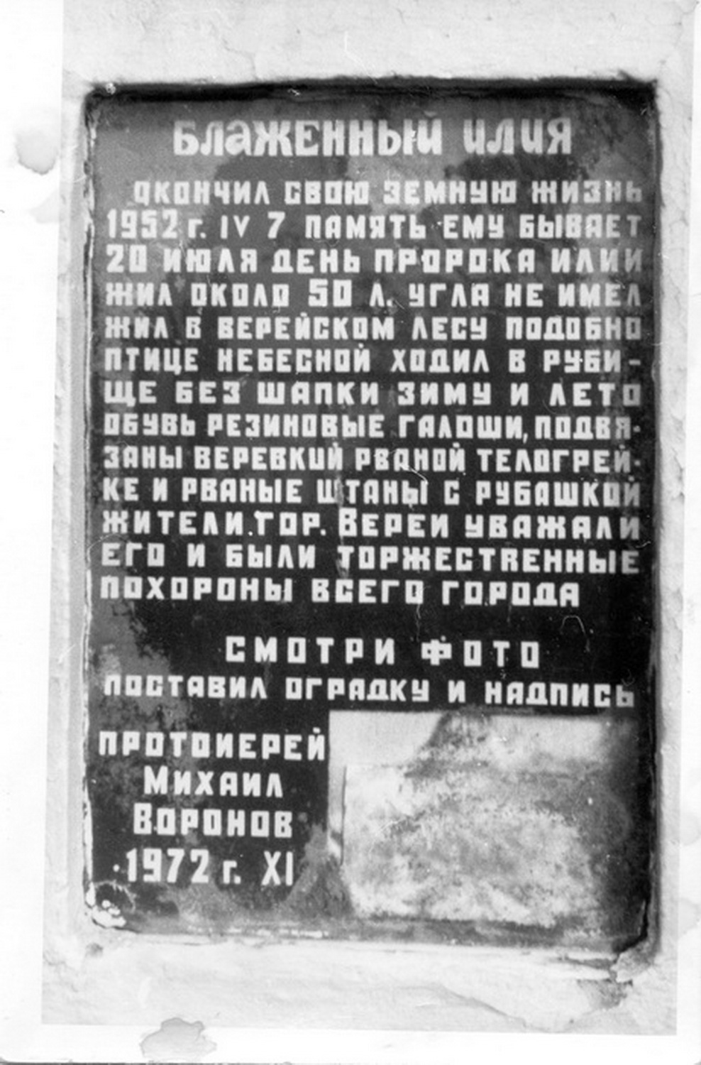 По инициативе казака Столичной сотни Ставропольского казачьего войска Союза казаков России, Годуновского отдела Конвоя Памяти Государя Императора Николая II в Подмосковье Краснова Владимира Николаевича, по благословению о. Валерия, активной поддержке руководителя гранитной мастерской города Вереи Первого Дмитрия Александровича; Пулявиной Татьяны Геннадьевны и Конавалова Андрея Вячеславовича (фирма «Грааль») на Вознесенском кладбище города Вереи проведена реконструкция памятника Блаженному Илие.