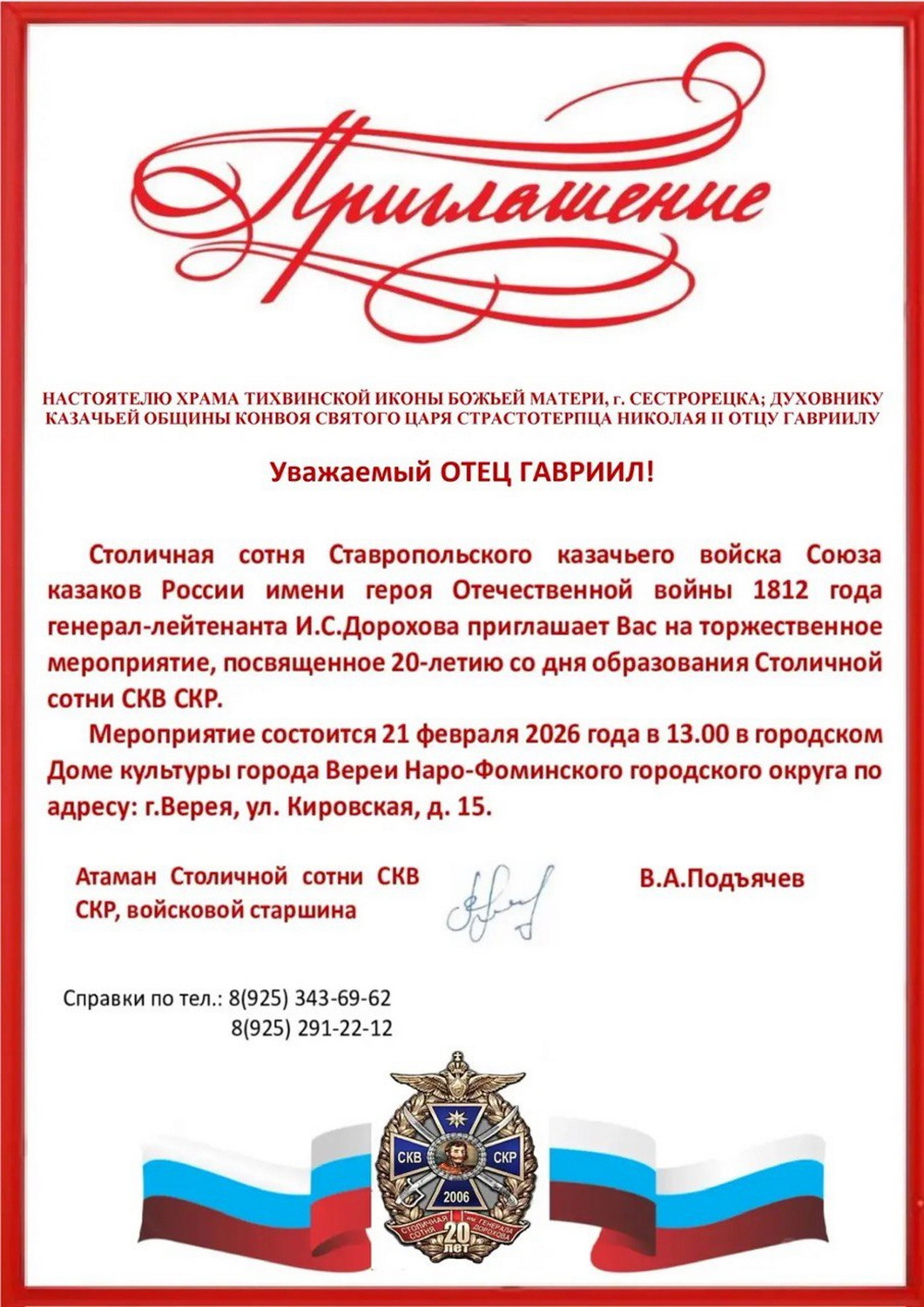 Приглашение настоятелю храма Тихвинской иконы Божией Матери Сестрорецка, духовнику Конвоя Памяти Государя Императора Николая II архимандриту Гавриилу (Коневиченко) на торжественное мероприятие, посвященное 20-летию со дня основания Столичной сотни СКВ СКР от атамана Столичной сотни СКВ СКР, войскового старшины В.А. Подъячева