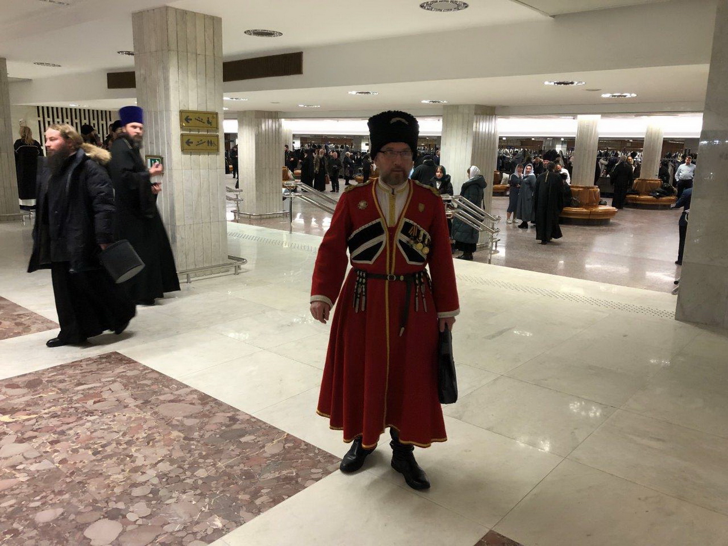 На память о Рождественских чтениях 2026 г. конвойцы сделали общее фото в вестибюле. Кстати, на встрече присутствовали и ещё хопёрские конвойцы – иерей Андрей Саврасов и Вячеслав Деев — директор патриотического Центра «Казачье братство».