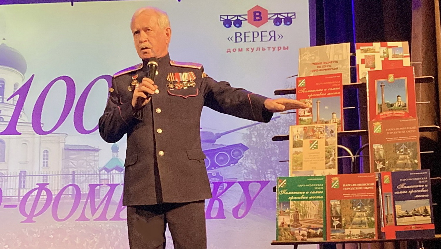 В городском Доме культуры собравшихся жителей города, учеников Верейской средней школы с праздничной датой поздравил Почетный гражданин города Вереи и Наро-Фоминского района, Заслуженный работник культуры Московской области, начальник штаба Годуновского отдела Конвоя Памяти Государя Императора Николая II в Подмосковье и Столичной сотни Ставропольского казачьего войска Союза казаков России, казачий полковник Ю.В. Комаровский. Юрий Владимирович – автор многих книг о Наро-Фоминской земле. На сцене были представлены его книги о Наро-Фоминске.