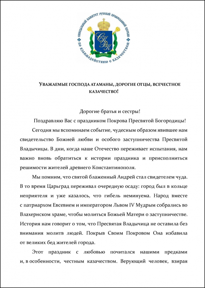 14 октября 2022 года. Митрополит Кирилл поздравил с праздником Покрова всечестное казачество