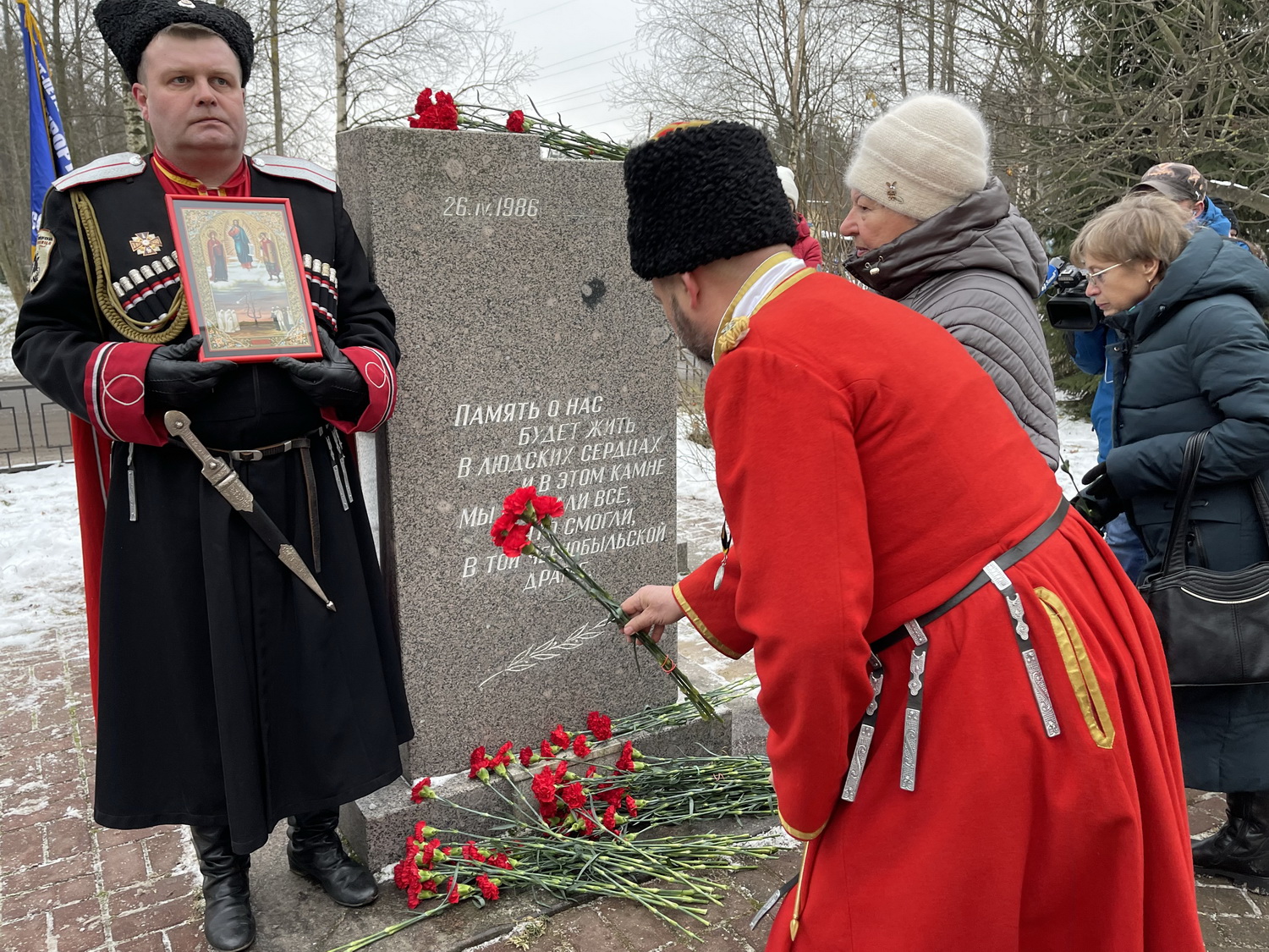 Участники мероприятия возложили цветы у памятного знака жертвам радиационных аварий и катастроф, а казаки общины «Невская сечь» раздавали православные календари на 2023 год всем участникам.