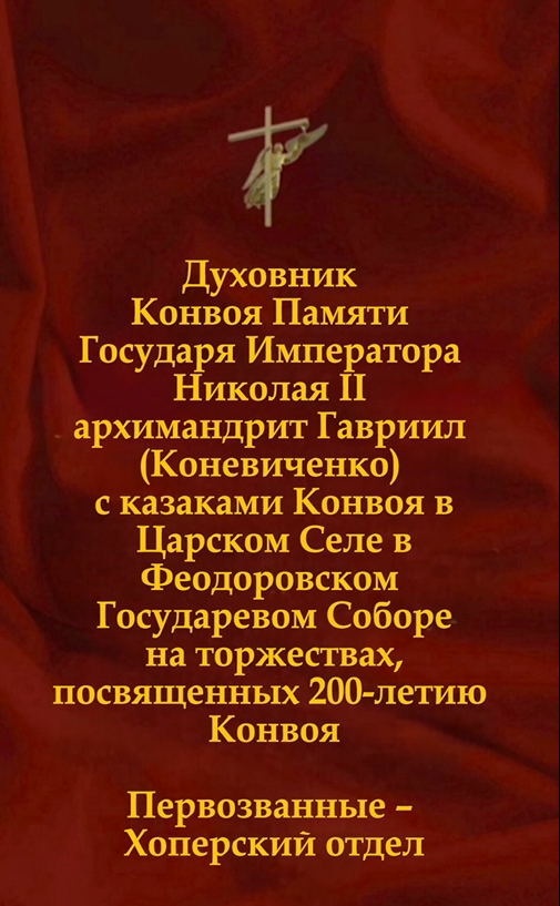Духовник Конвоя Памяти Государя Императора Николая II архимандрит Гавриил(Коневиченко)с казаками Конвоя в Царском Селе в ФеодоровскомГосударевом Соборе на торжествах, посвященных 200-летию Конвоя. Первозванные – Хоперский отдел