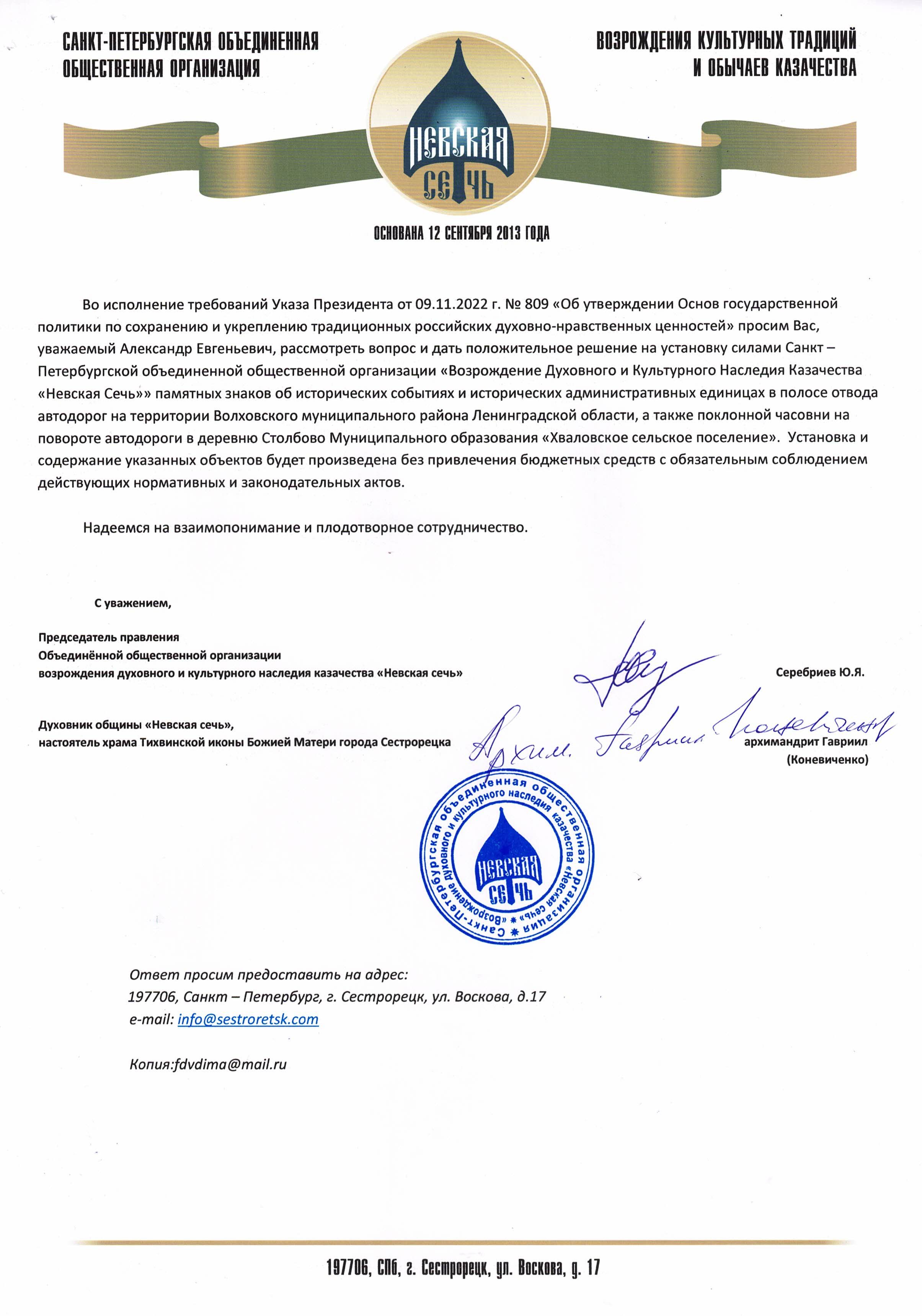 25 августа 2025 года. Письмо Главе администрации Волховского муниципального района Ленинградской области А.Е. Сафонову от Объединённой общественной организации возрождения духовного и культурного наследия казачества «Невская сечь»