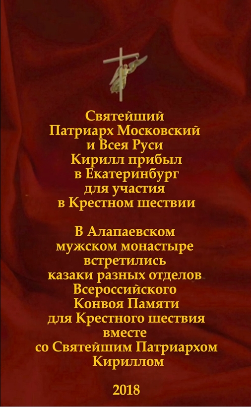 Святейший Патриарх Московский и Всея Руси Кирилл прибыл в Екатеринбург для участия в Крестном шествии. В Алапаевском мужском монастыре встретились казаки разных отделов Всероссийского Конвоя Памяти для Крестного шествия вместе со Святейшим Патриархом Кириллом. 2018