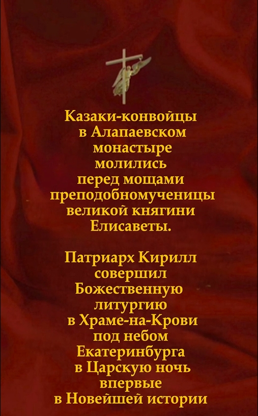 Казаки-конвойцы в Алапаевском монастыре молились перед мощами преподобномученицы великой княгини Елисаветы. Патриарх Кирилл совершил Божественную литургию в Храме-на-Крови под небом Екатеринбурга в Царскую ночь впервые в Новейшей истории