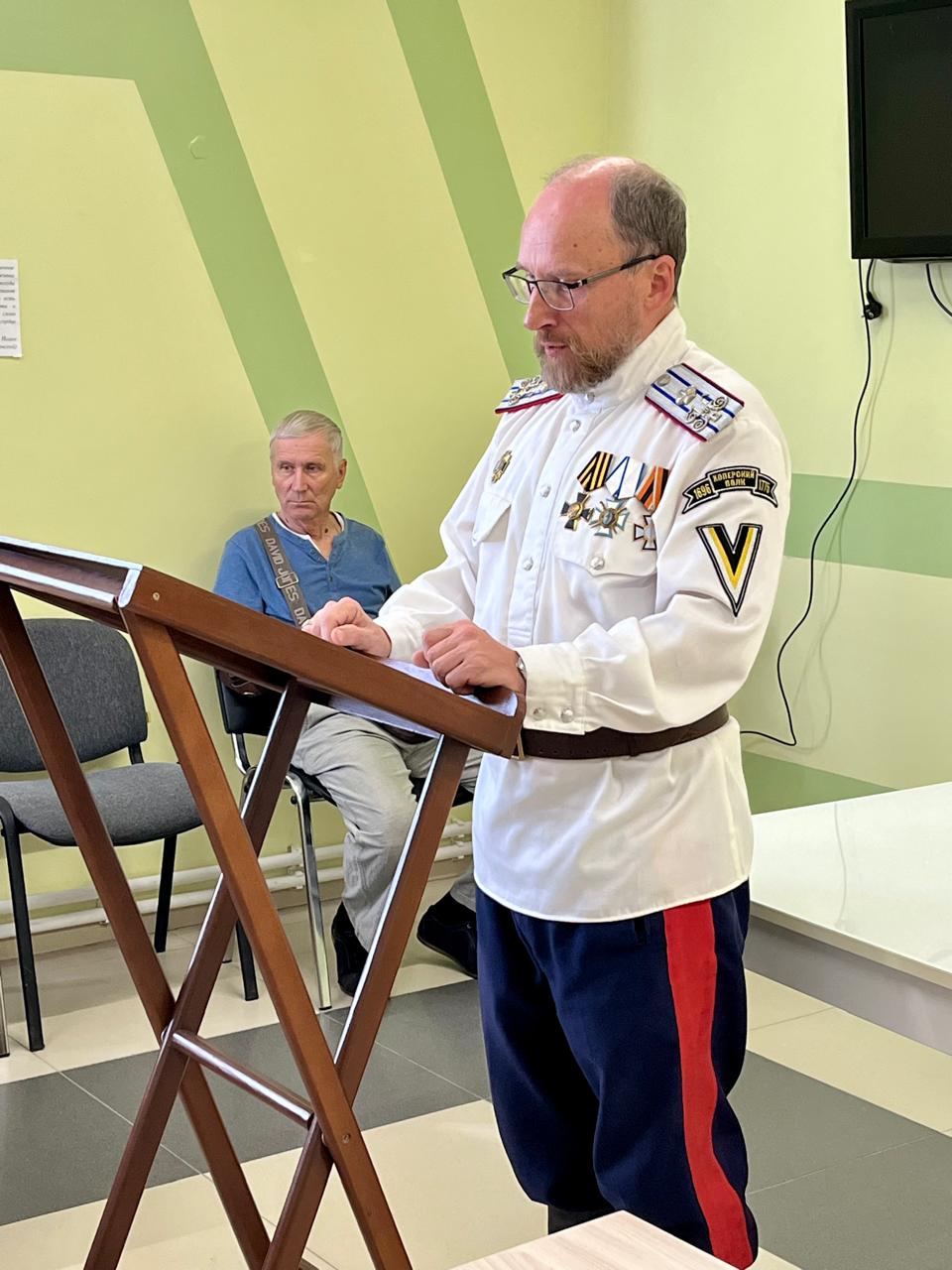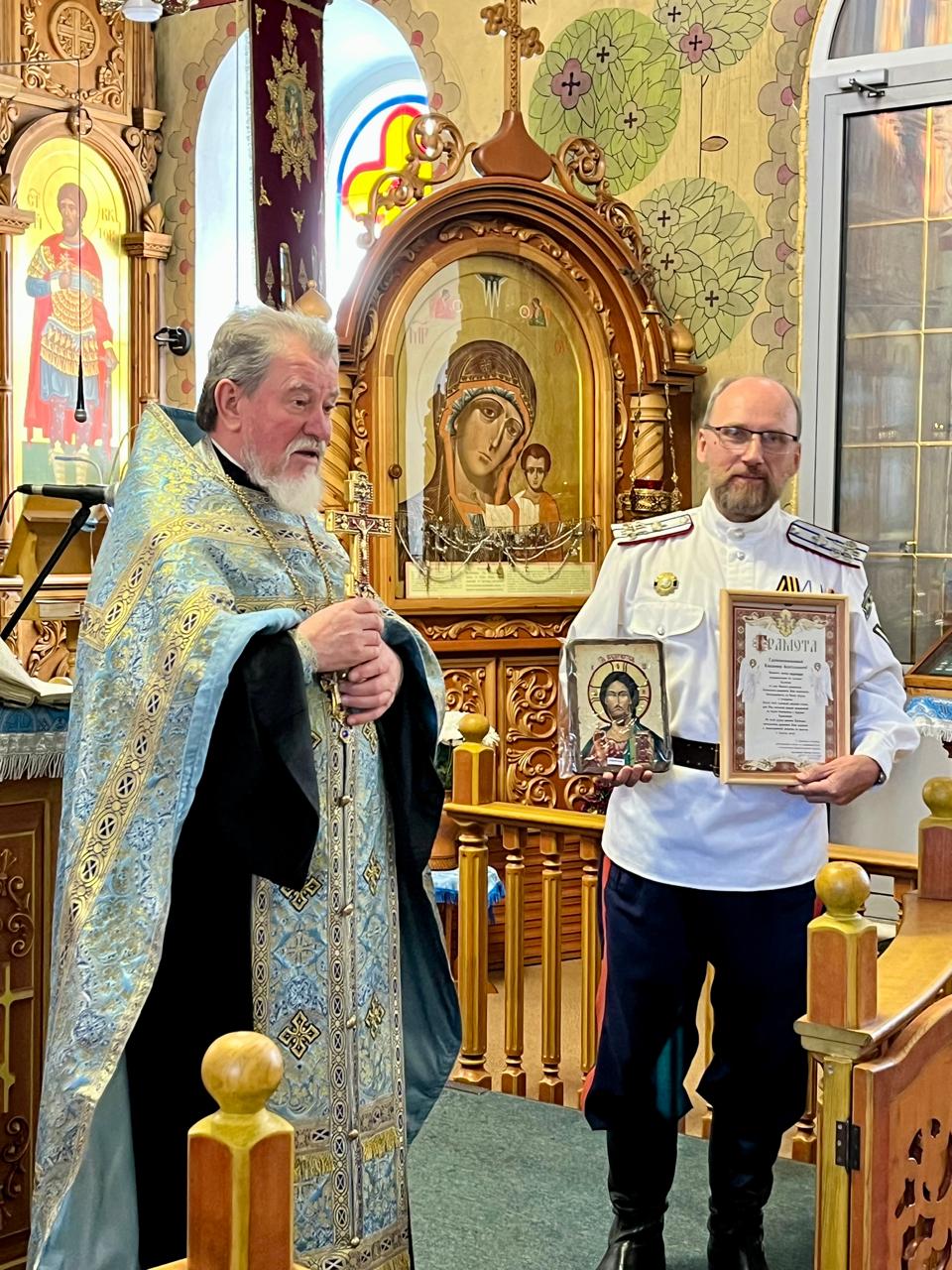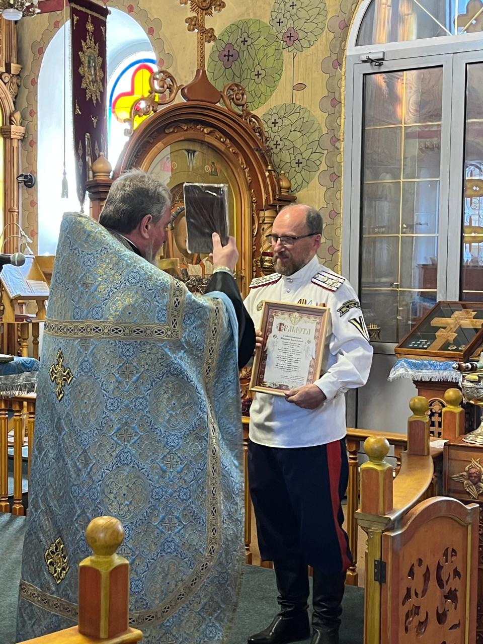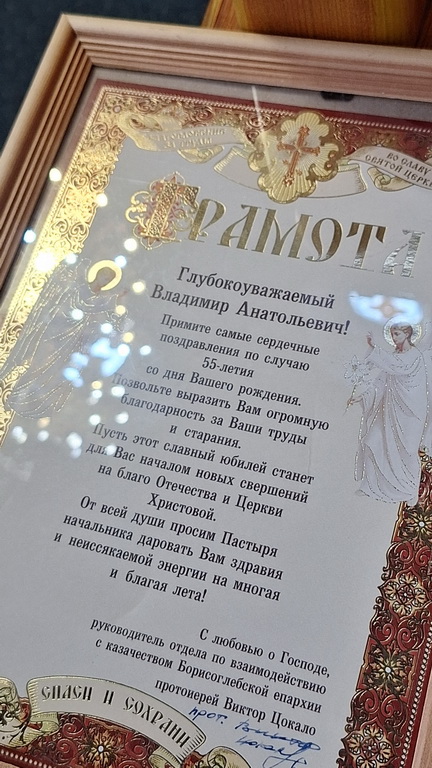 В связи с 55-летием со дня рождения, а также за труды и старания, руководитель отдела по взаимодействию с казачеством протоиерей Виктор Цокало вручил грамоту Владимиру Анатольевичу Лаенко — атаману Хоперского полкового округа Северо-Донского казачьего войска, вахмистру Хоперского отдела Конвоя Святого Царя Страстотерпца Николая II.