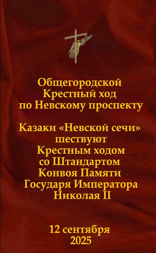 Общегородской Крестный ход по Невскому проспекту. Казаки «Невской сечи» шествуют Крестным ходом со Штандартом Конвоя Памяти Государя Императора Николая II. 12 сентября 2025