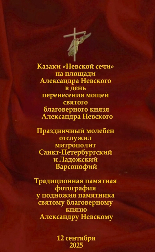 Казаки «Невской сечи» на площади Александра Невского в день перенесения мощей святого благоверного князя Александра Невского. Праздничный молебен отслужил митрополит Санкт-Петербургский и Ладожский Варсонофий. Традиционная памятная фотография у подножия памятника святому благоверному князю Александру Невскому. 12 сентября 2025