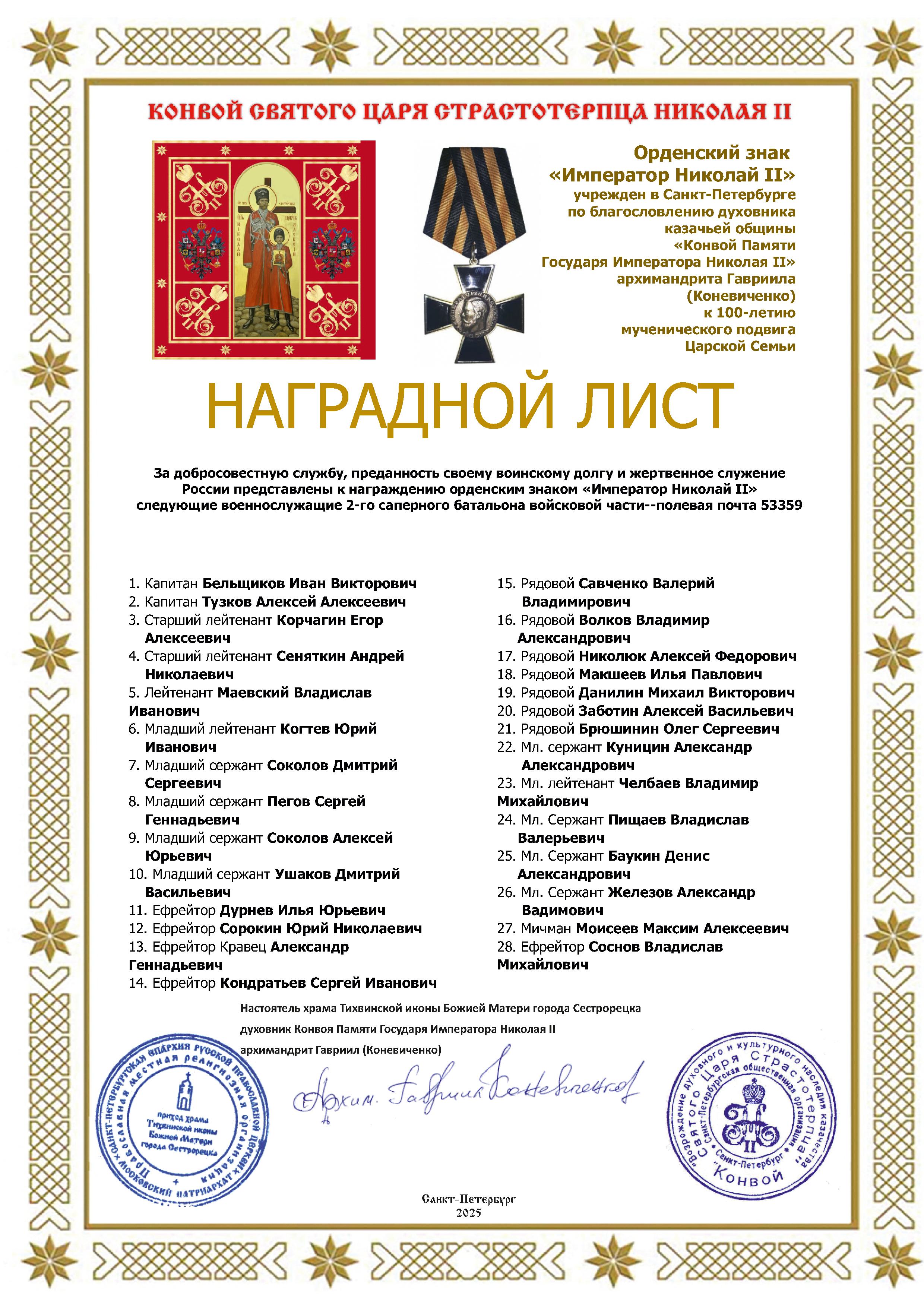 Наградной лист на награждение военнослужащих 2 саперного батальона военнослужащих 2-го саперного батальона войсковой части-полевая почта 53359