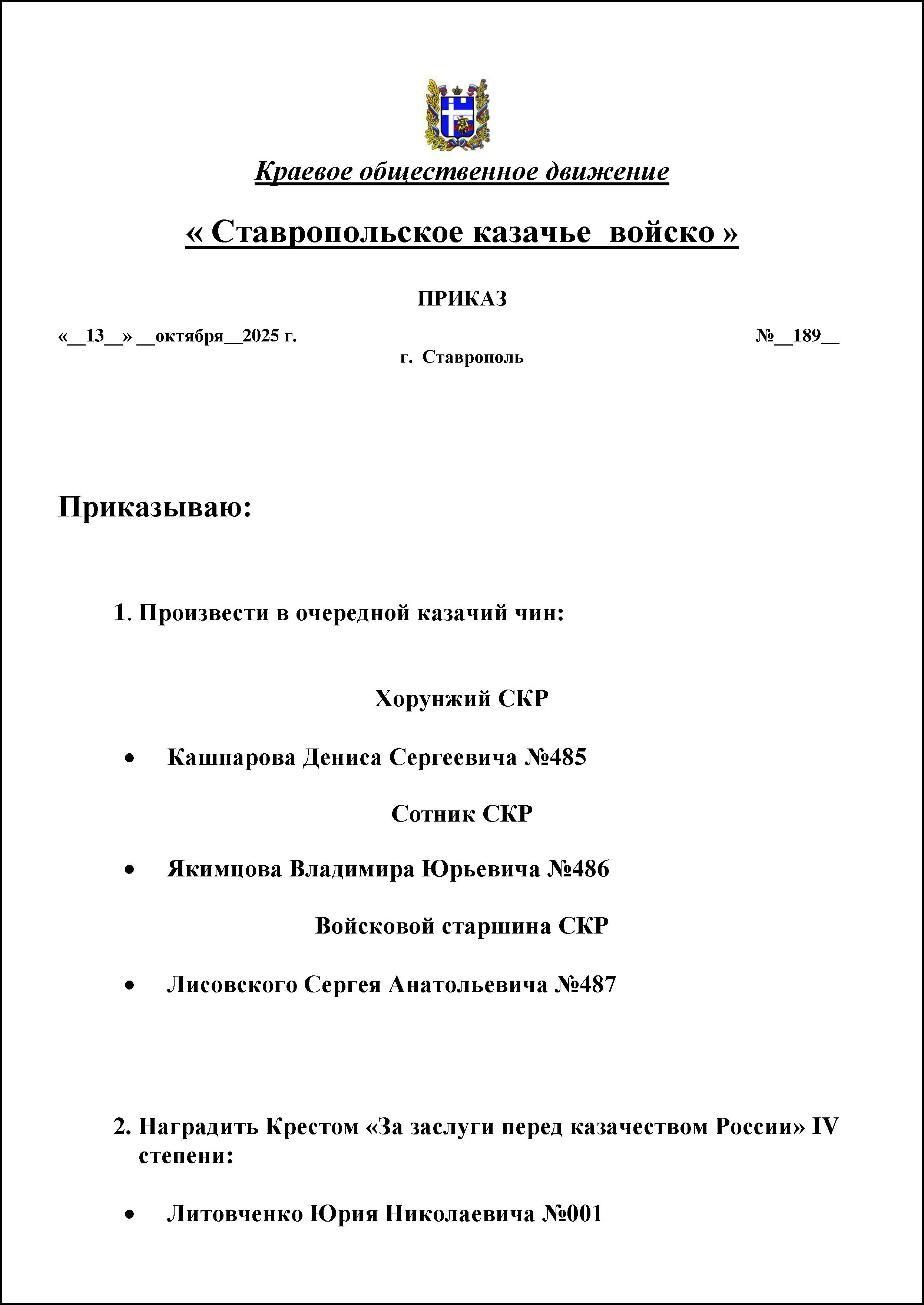 Приказом №189 от 13 октября 2025 года по Ставропольскому казачьему войску Сергей Анатольевич Лисовский производится в чин Войскового старшины Союза казаков России. |