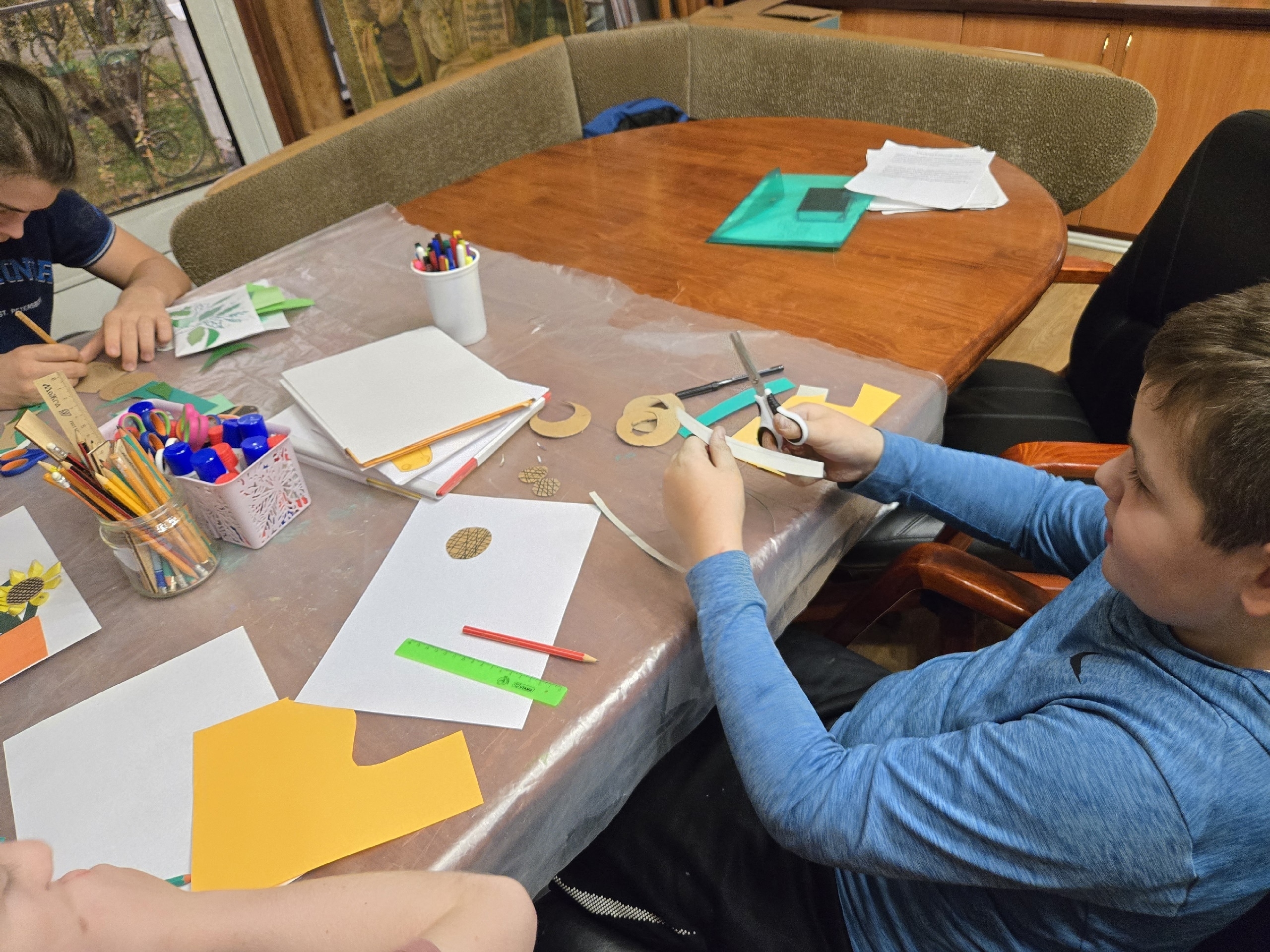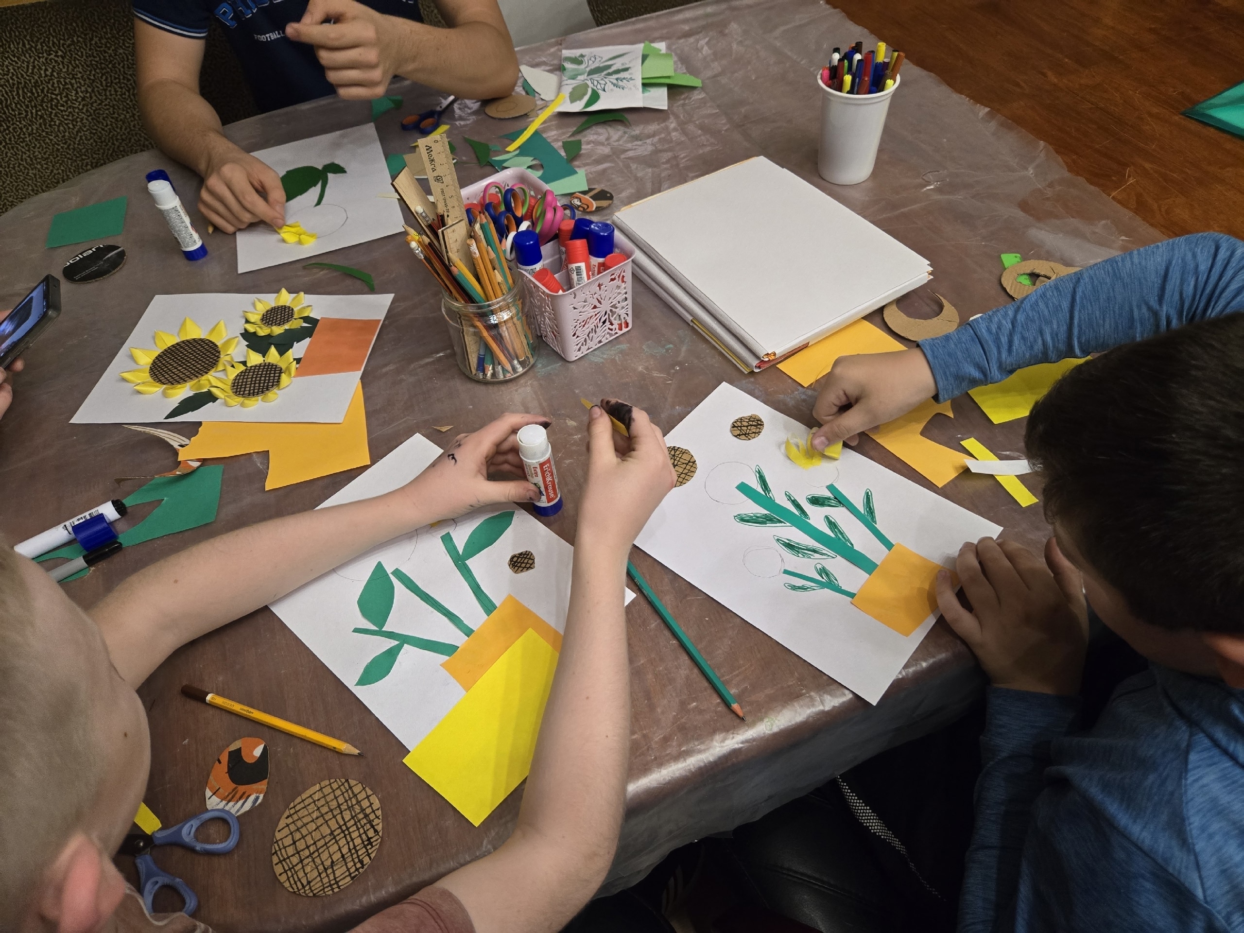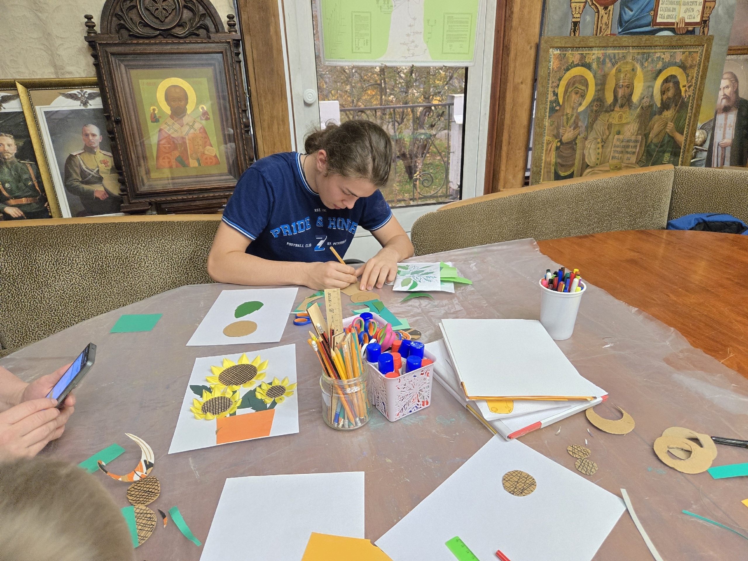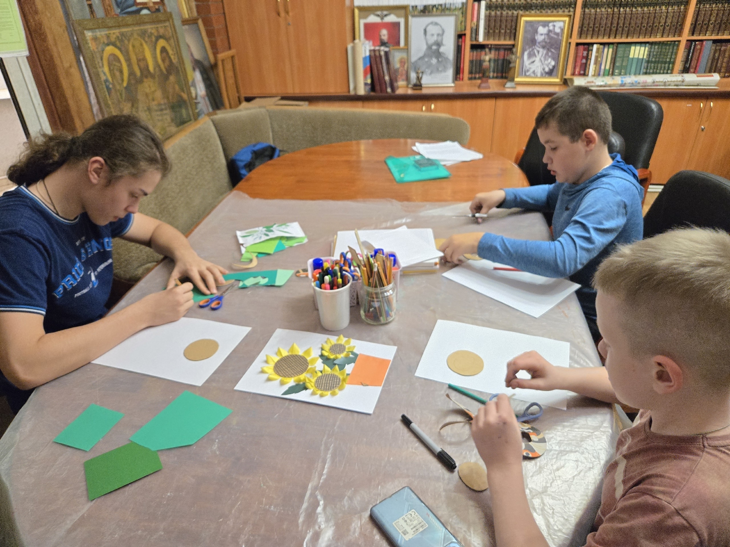 На уроке рукоделия дети с большим увлечением создавали бумажные аппликации с изображением подсолнухов. Этот цветок, находящийся на границе лета и осени, символичен: его стремление к солнечному свету подобно стремлению человеческой души к Богопознанию.