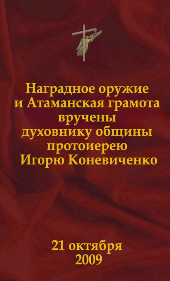 Наградное оружие и Атаманская грамота вручены духовнику общины протоиерею Игорю Коневиченко. 21 октября 2009