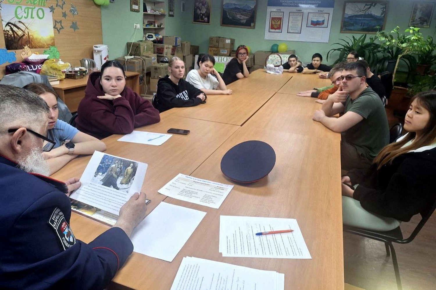 Студенты с интересом слушали рассказ казака-наставника, наказного атамана Камчатского отдела Конвоя Памяти Государя Императора Николая II Федора Олеговича Савченко.