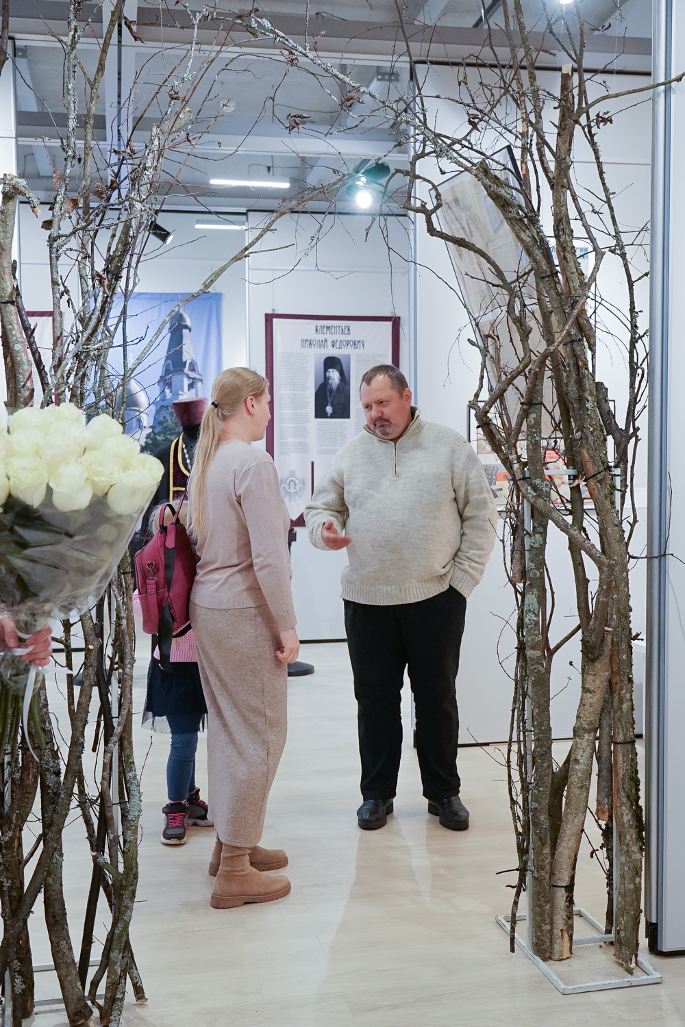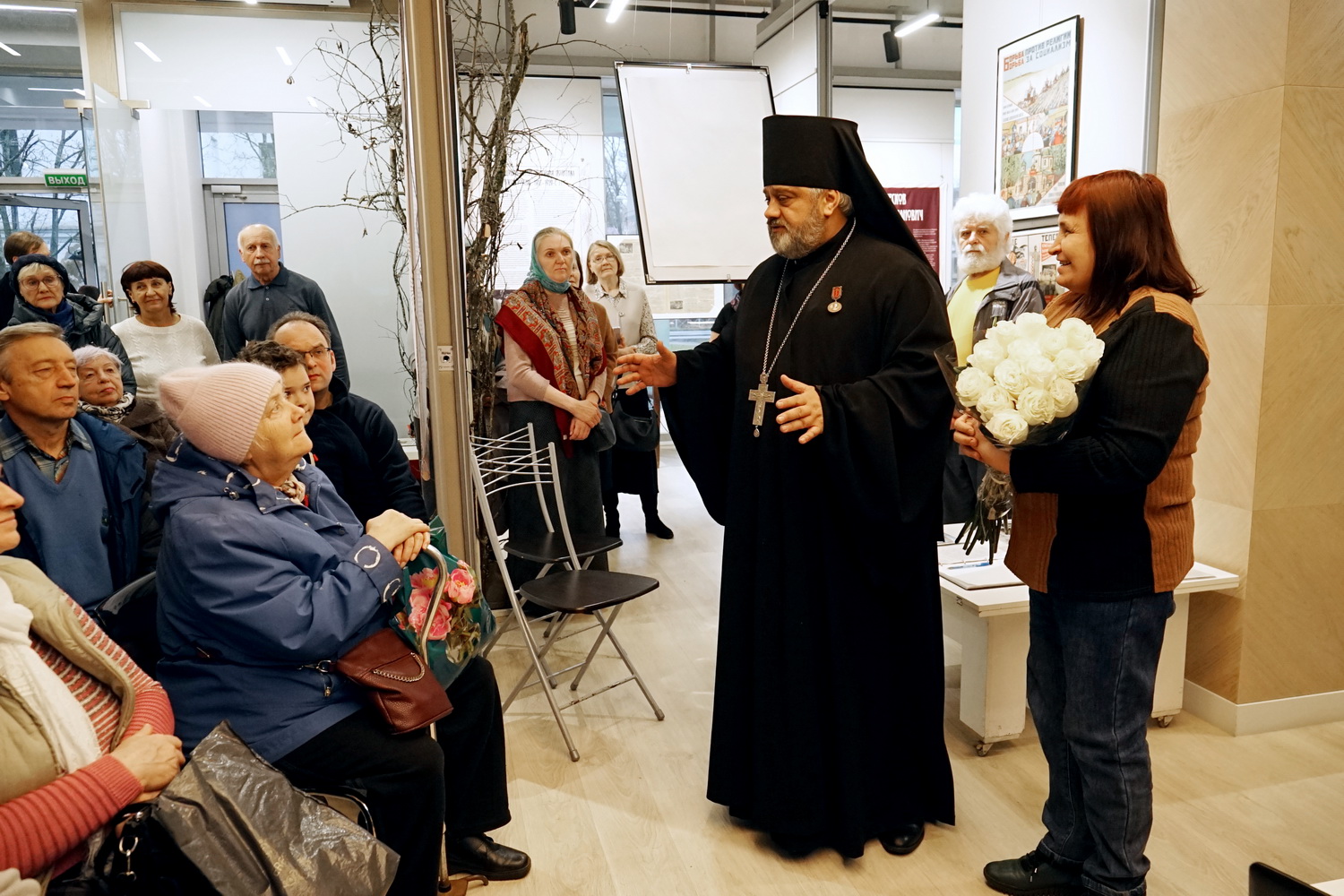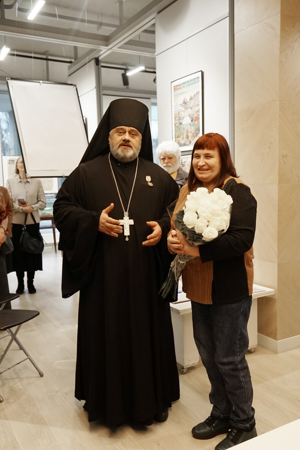 Архимандрит Гавриил поблагодарил Татьяну Вениаминовну за ее труд, который позволил прикоснуться к жизни святого и почувствовать его духовное влияние и вручил ей в знак признательности букет белых роз.