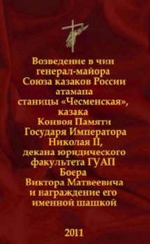 Возведение в чин генерал-майора Союза казаков России атамана станицы «Чесменская», казака Конвоя Памяти Государя Императора Николая II, декана юридического факультета ГУАП Боера Виктора Матвеевича и награждение его именной шашкой. 2011