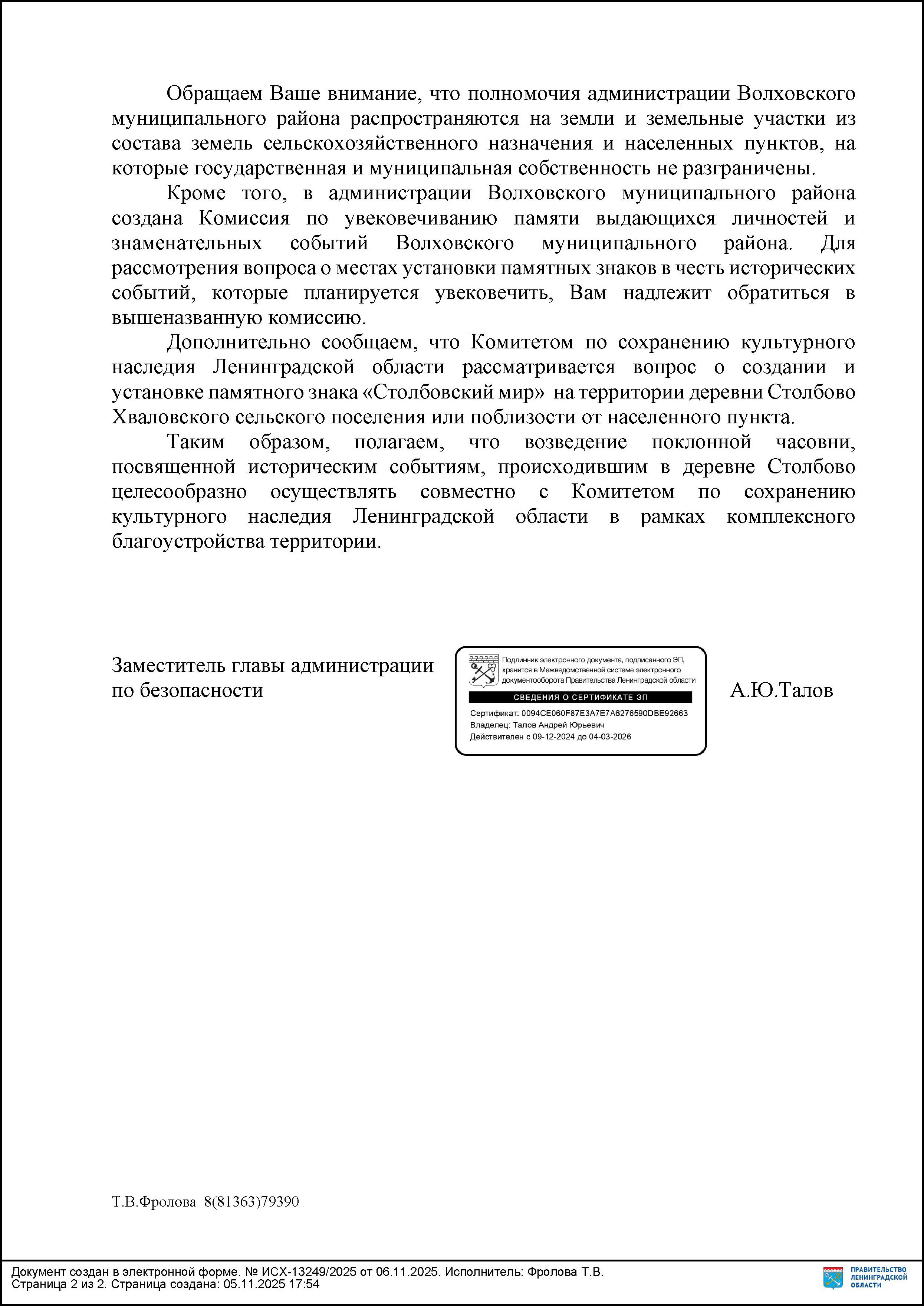 6 ноября 2025 года. Ответ администрации Волховского муниципального района Ленинградской области на обращение от Объединённой общественной организации возрождения духовного и культурного наследия казачества «Невская сечь»