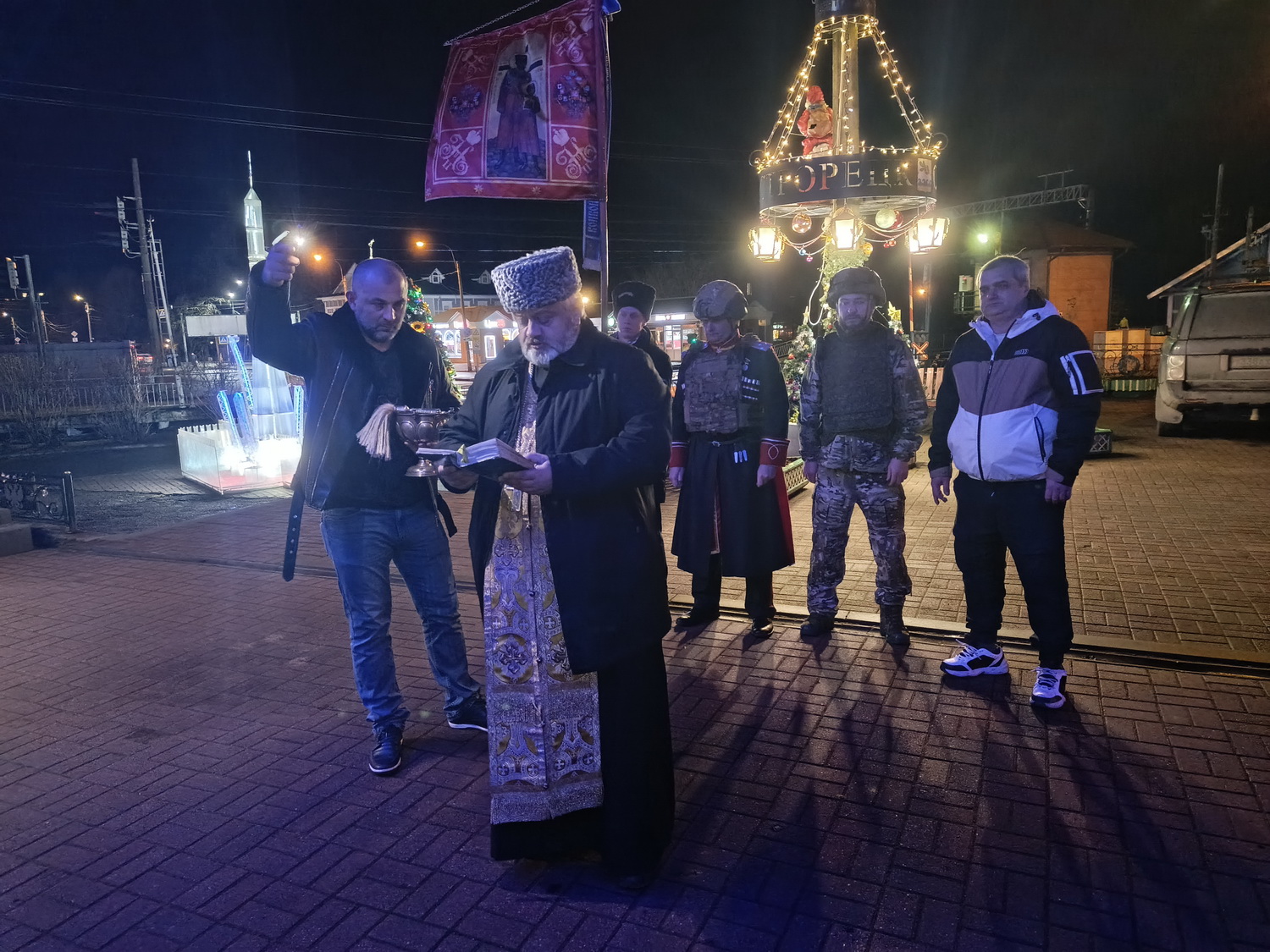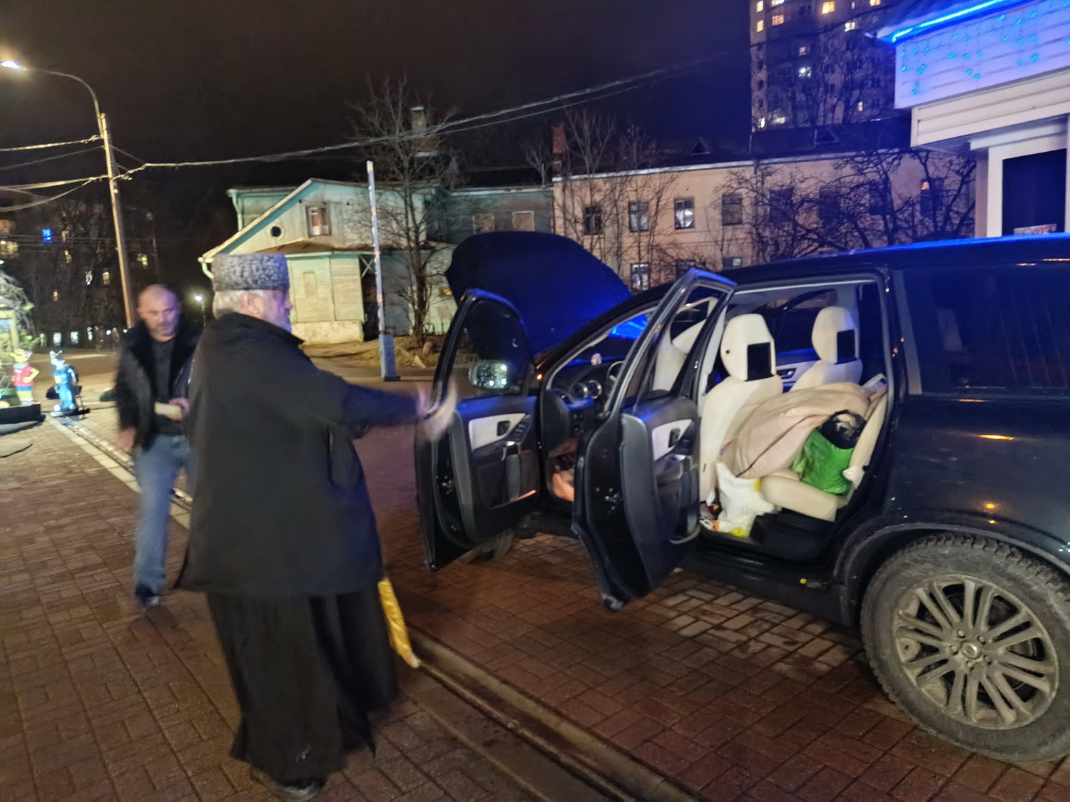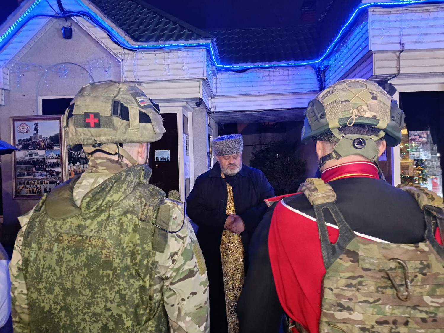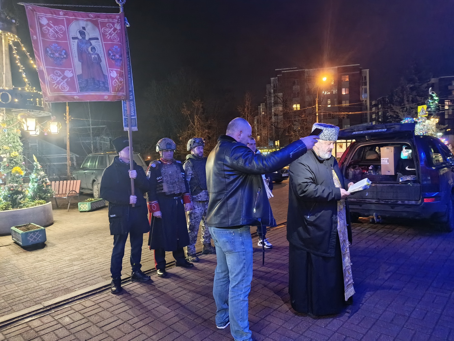 Настоятель храма Тихвинской иконы Божией Матери города Сестрорецка, духовник казачьей общины «Невская сечь» архимандрит Гавриил (Коневиченко) окропил святой водой внедорожник и детские Новогодние подарки, которыми доверху загрузили в автомобиль.