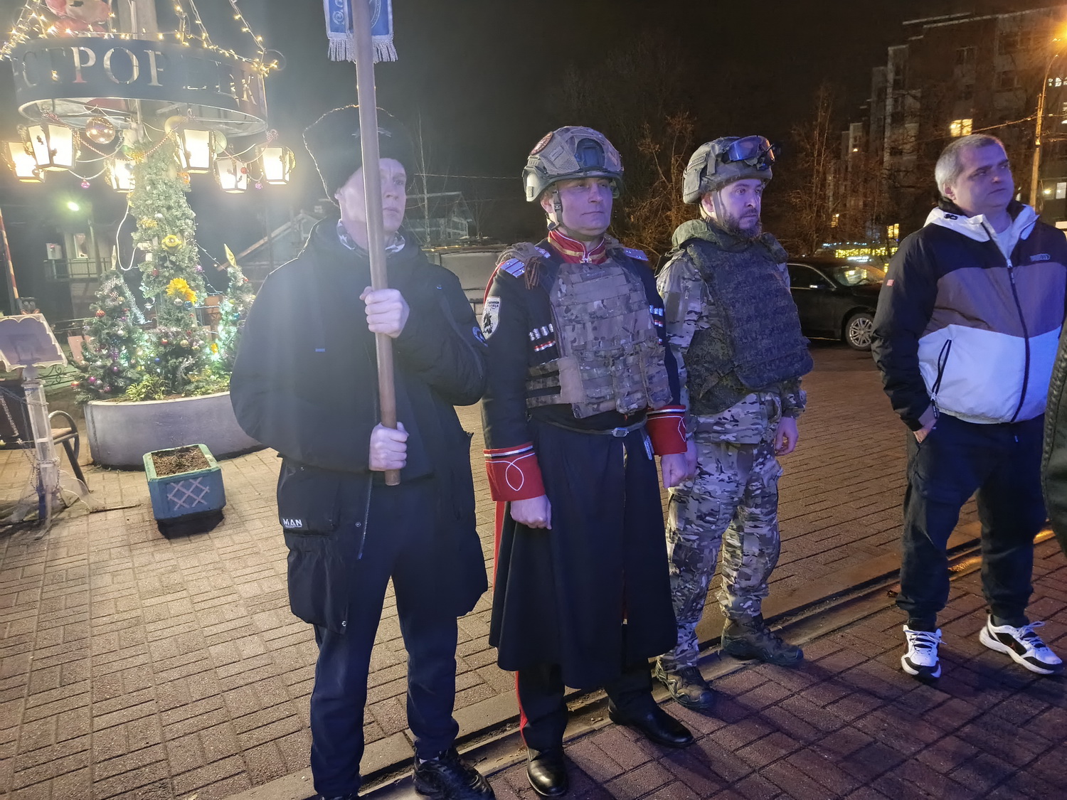 Участники конвоя казаки «Невской сечи» Иван Немирович и Павел с позывным «Снайпер» и атаман подразделения Экологической полиции при казачьей общине «Невская сечь», войсковой старшина, председатель СПб РОКО «Союз Донбассовцев», главный редактор газеты «Общество и Экология», член Союза журналистов России С. А. Лисовский.
