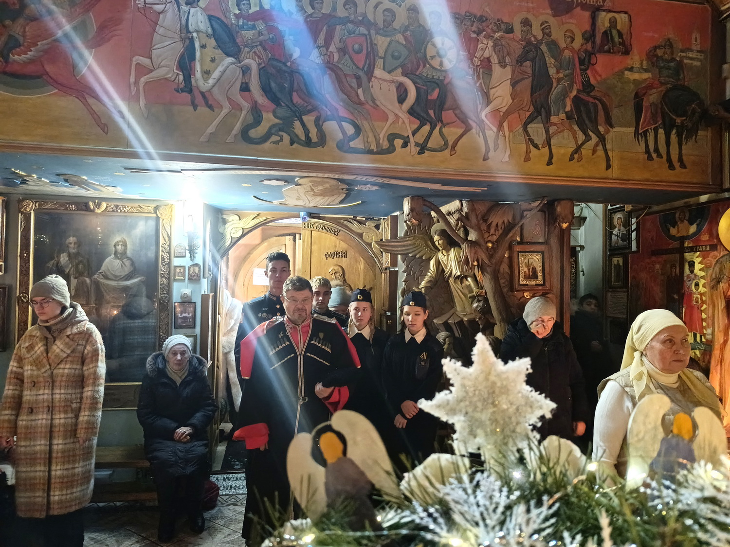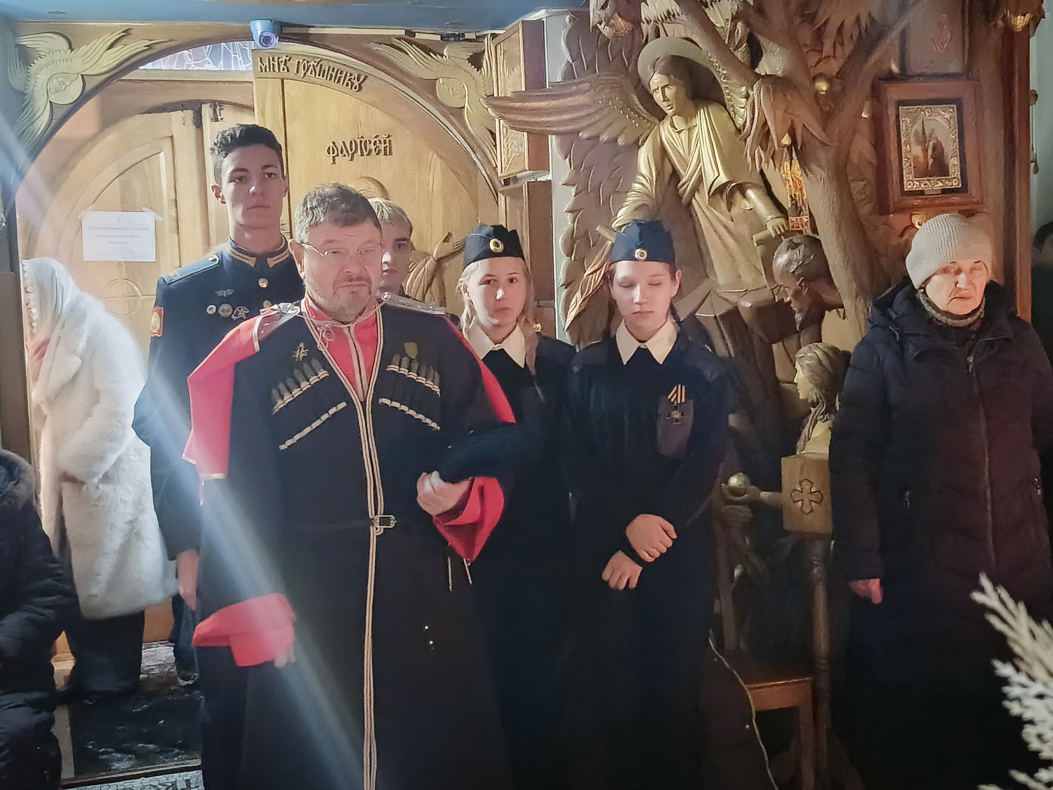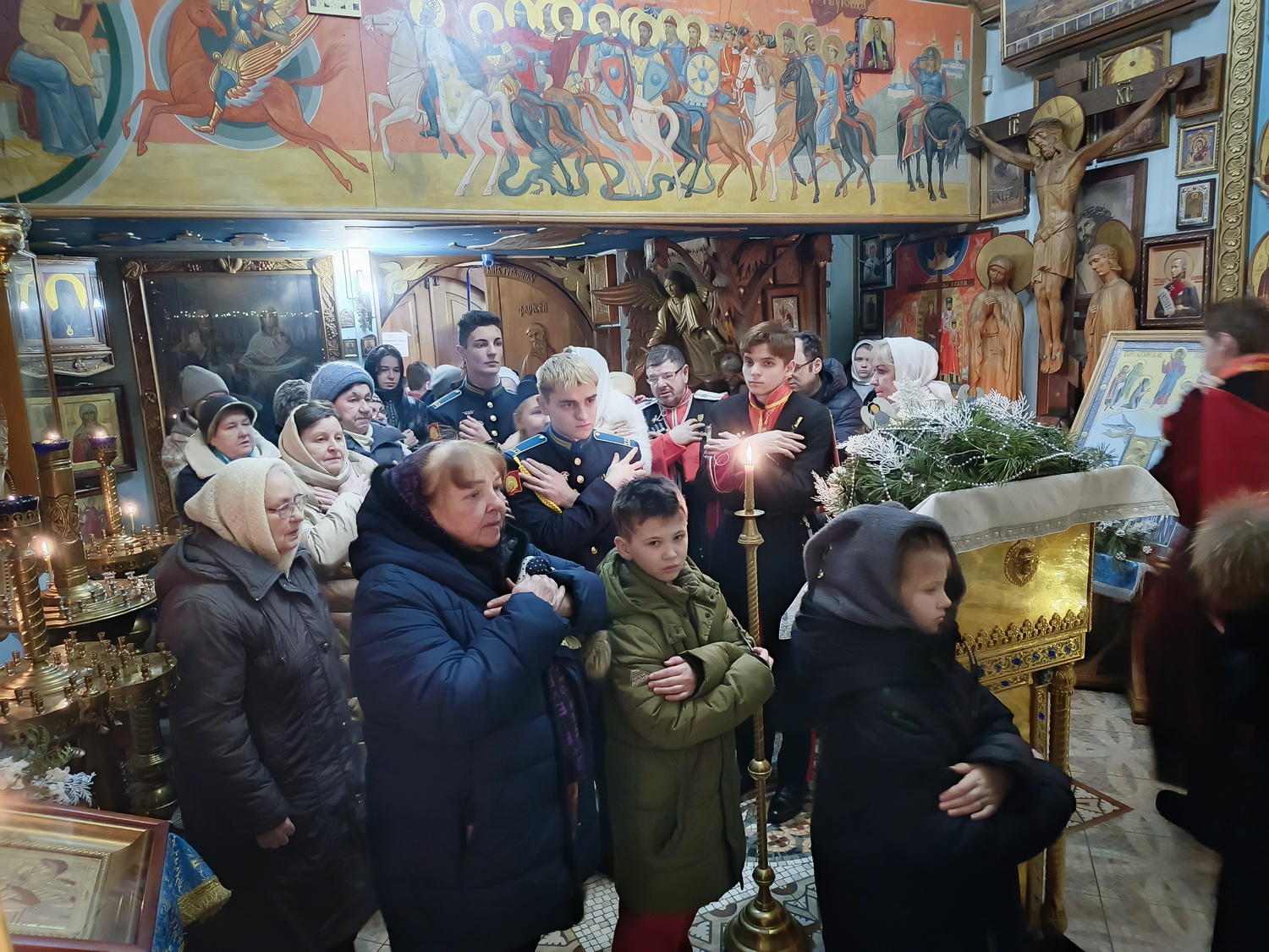 За Божественной литургией вместе с прихожанами храма молились казаки объединенной казачьей общины  «Невская сечь», Православной молодежной казачьей общины  «Есаул» и казачата Маленькой сотни Цесаревича Алексия. Также на литургии молились наказной атаман Петрозаводского отдела Конвоя Памяти Государя Императора Николая II, преподаватель дополнительного образования ППКУ С.А. Тяжелков и кадеты Петрозаводского президентского кадетского училища, прибывшие накануне из Республики Карелия.