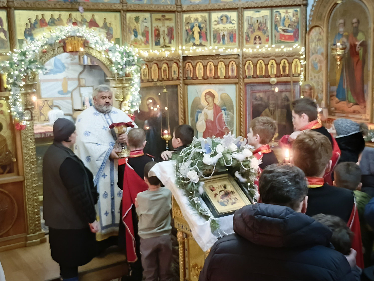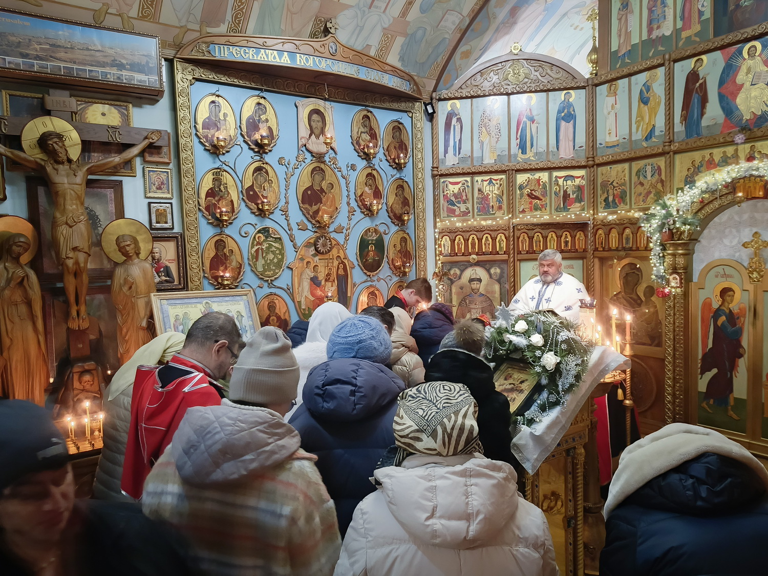 Затем отец Гавриил поздравил прихожан с Рождеством Христовым и пригласив всех молящихся на праздничный молебен к Рождественскому вертепу который находится перед знанием Духовно-просветительского центра.