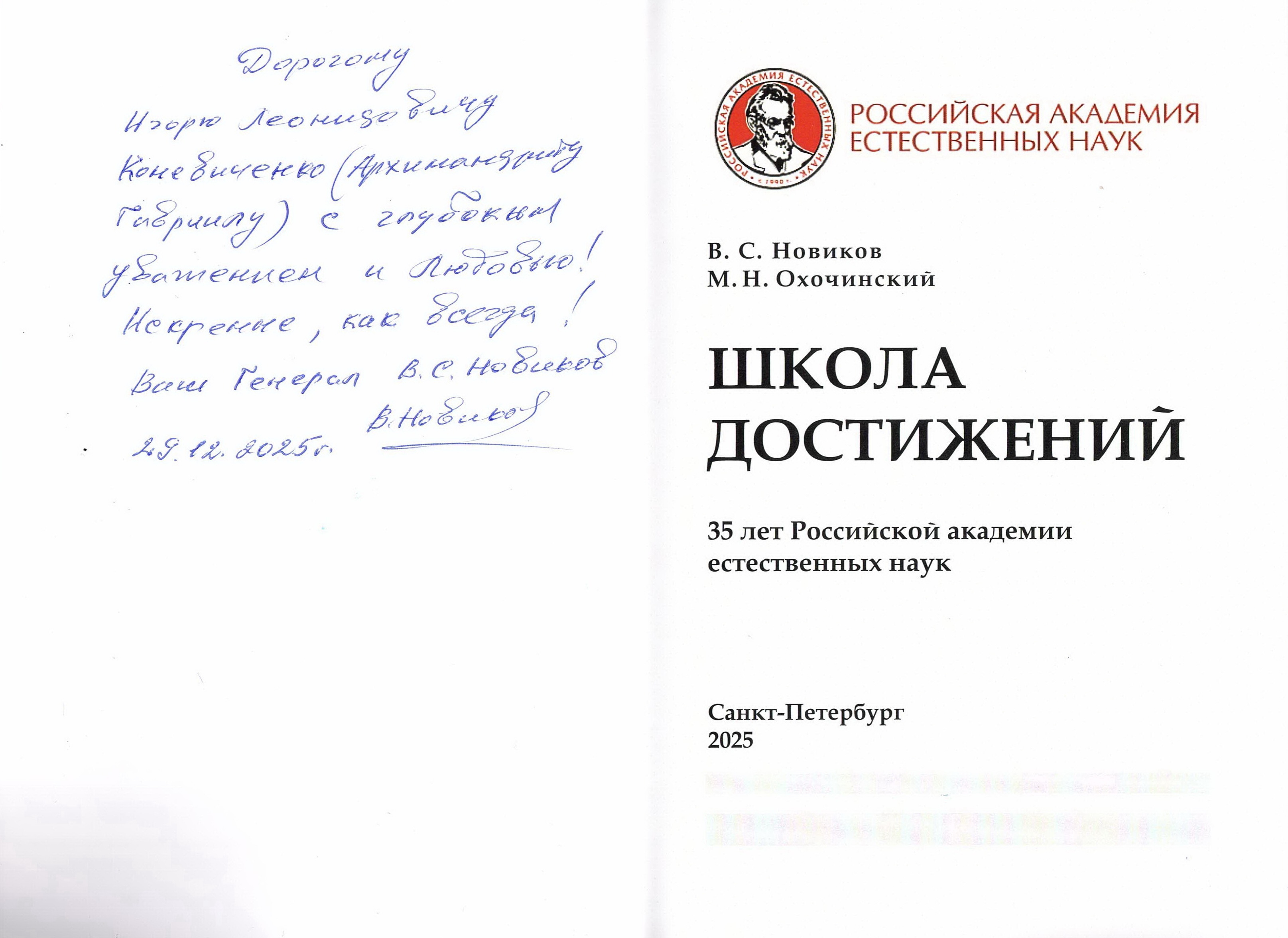30 декабря 2025 года Вице-президент РАЕН В.С. Новиков передал в дар для Библиотеки Памяти Государя Императора Николая II книгу «Школа достижений»