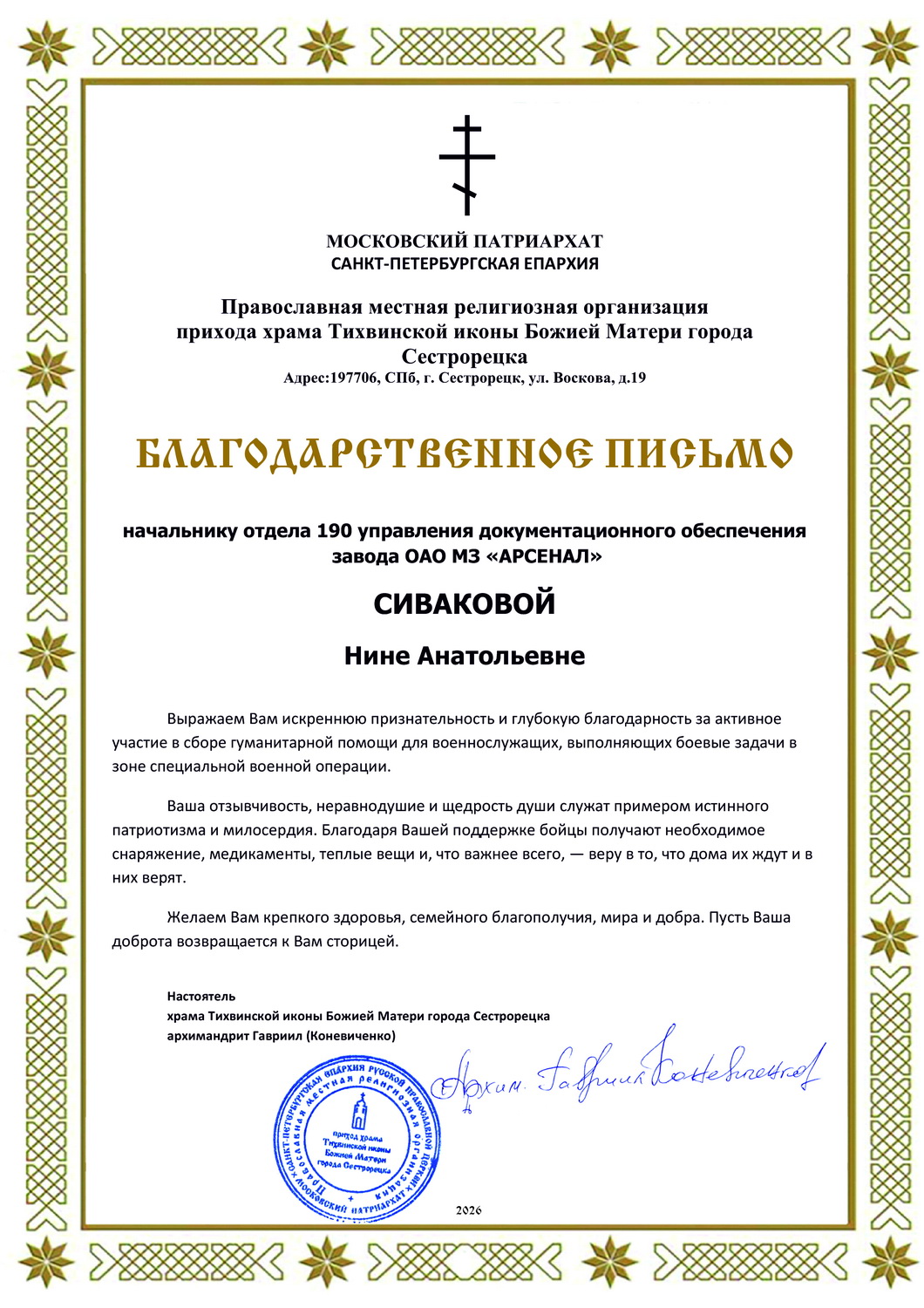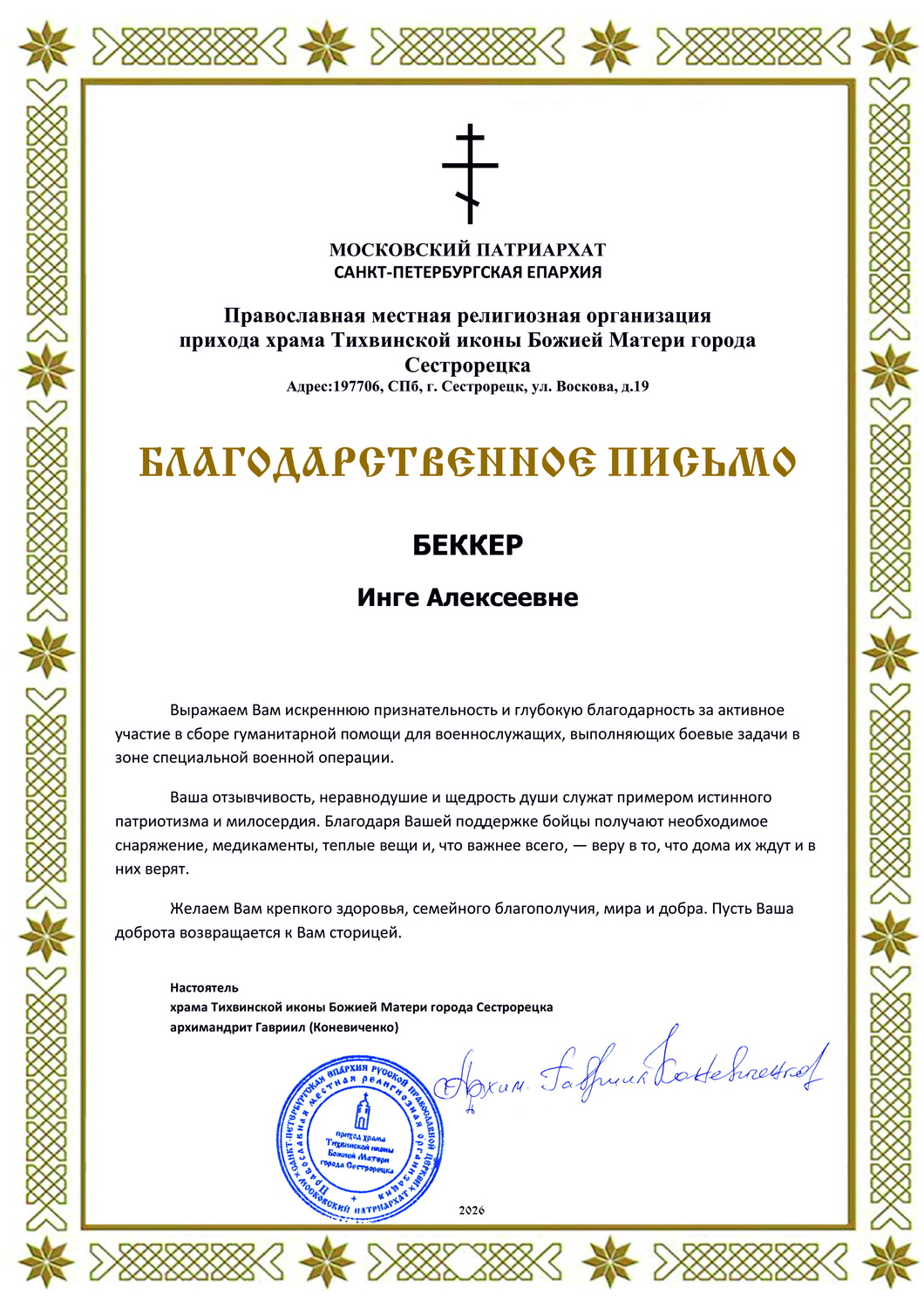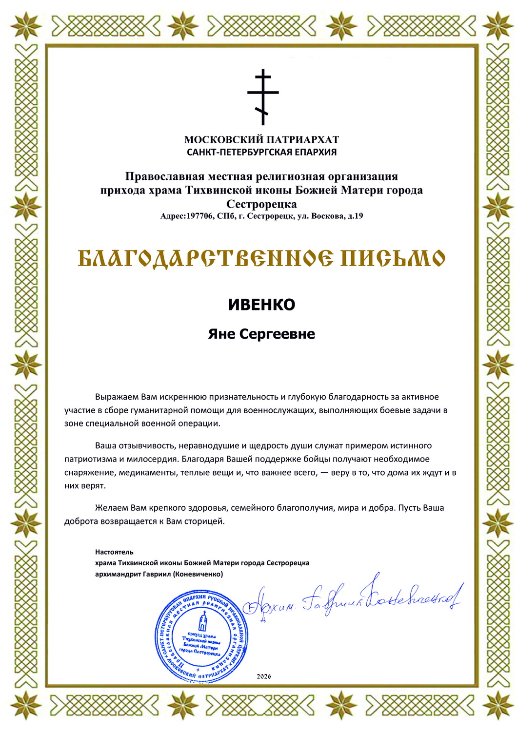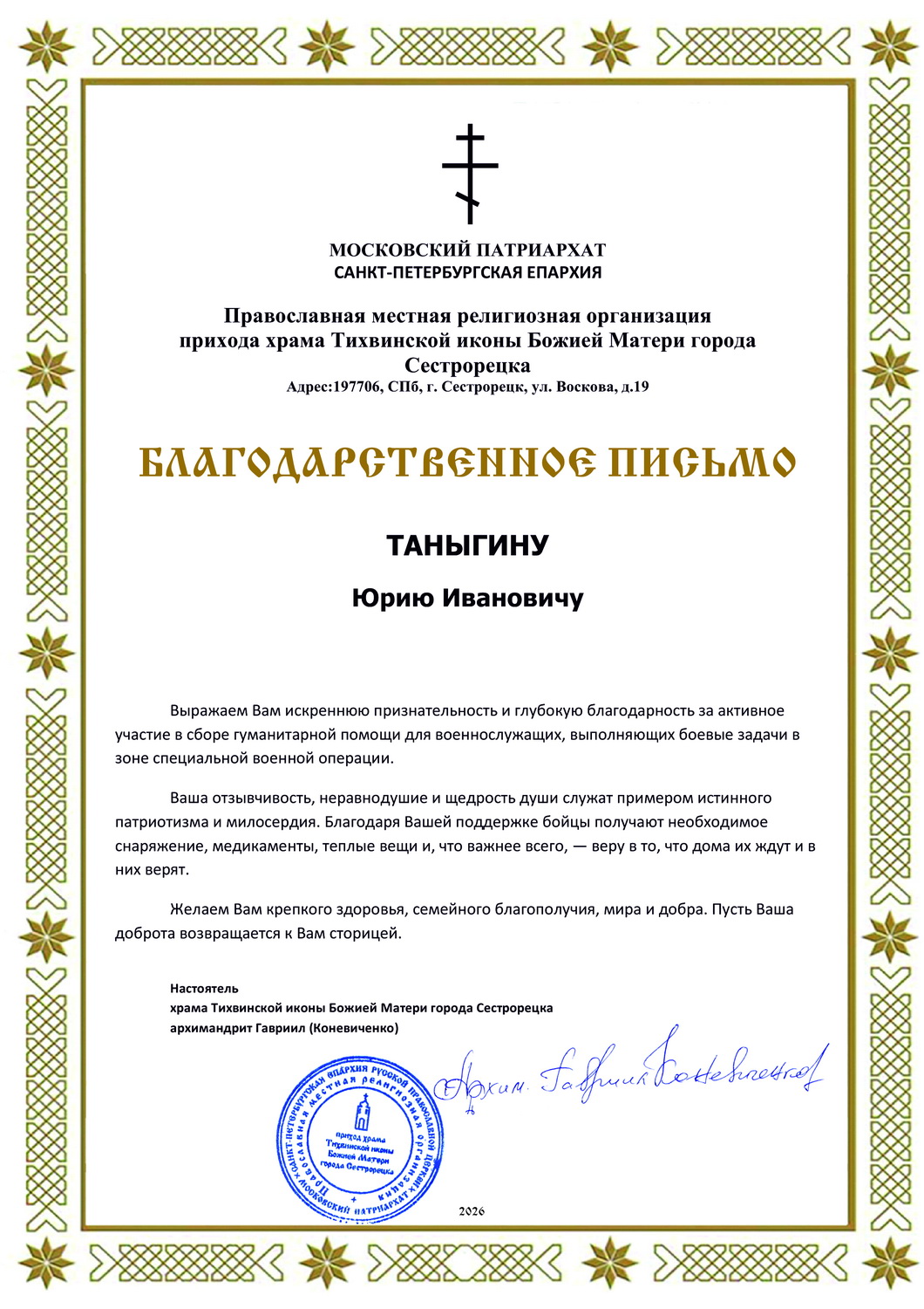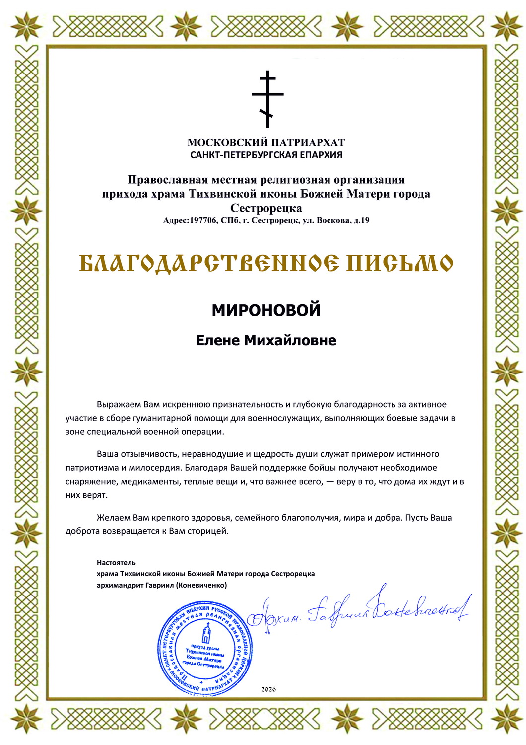 Благодарственные письма за активное участие в сборе гуманитарной помощи для военнослужащих, выполняющих боевые задачи в зоне специальной военной операции от настоятеля храма Тихвинской иконы Божией Матери города Сестрорецка архимандрита Гавриила (Коневиченко)