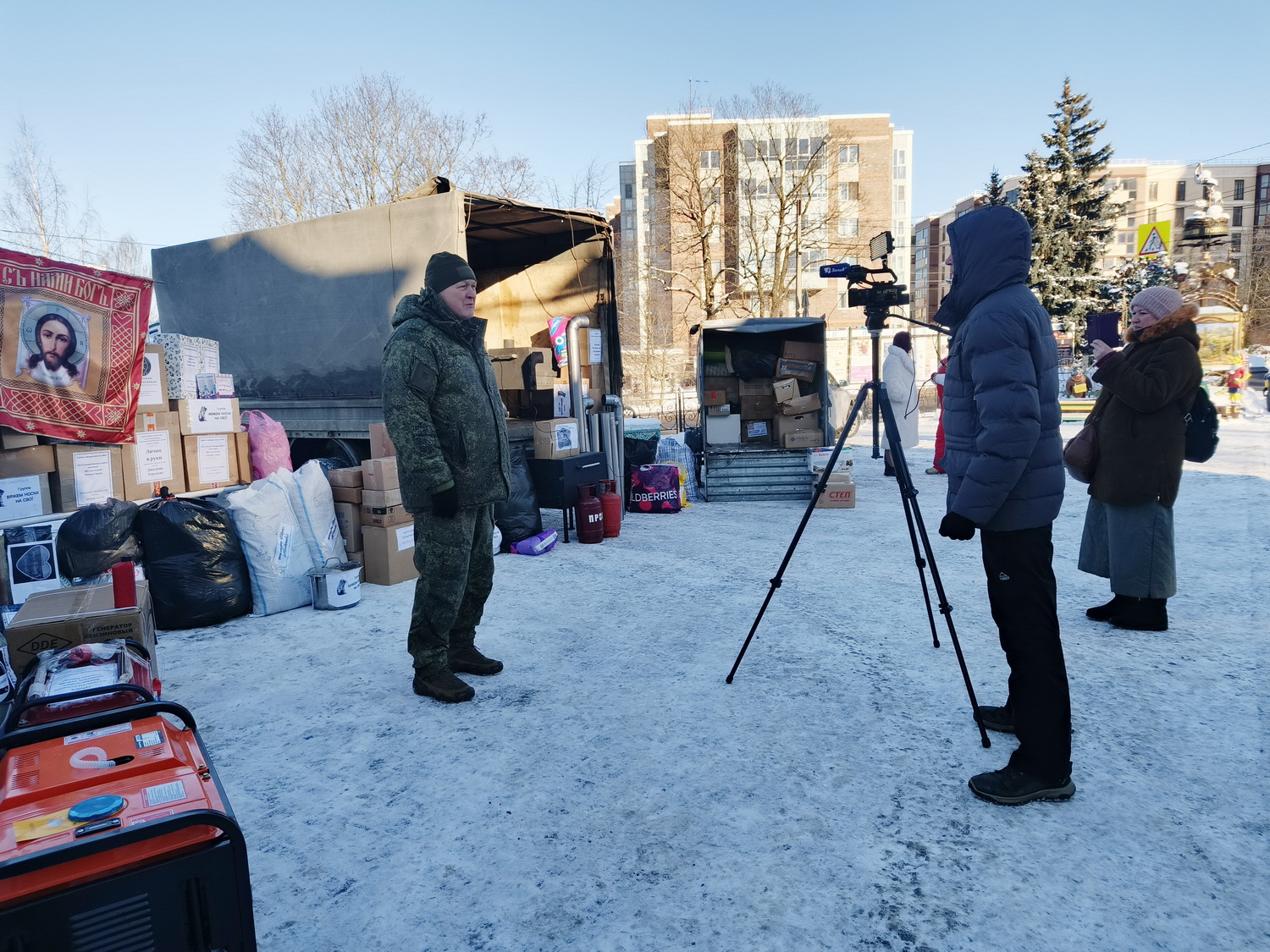 Духовник Батальона Цесаревича Алексия, настоятель храма Тихвинской иконы Божией Матери города Сестрорецка архимандрит Гавриил (Коневиченко) окропил святой водой автомобили с гуманитарным грузом.