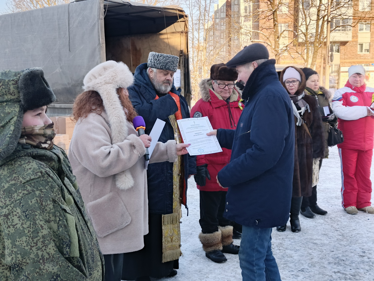 Затем батюшка поблагодарил всех причастных к сбору гуманитарной помощи, а именно казаков «Невской сечи», казаков братских казачьих общин благотворительные фонды и частных лиц.