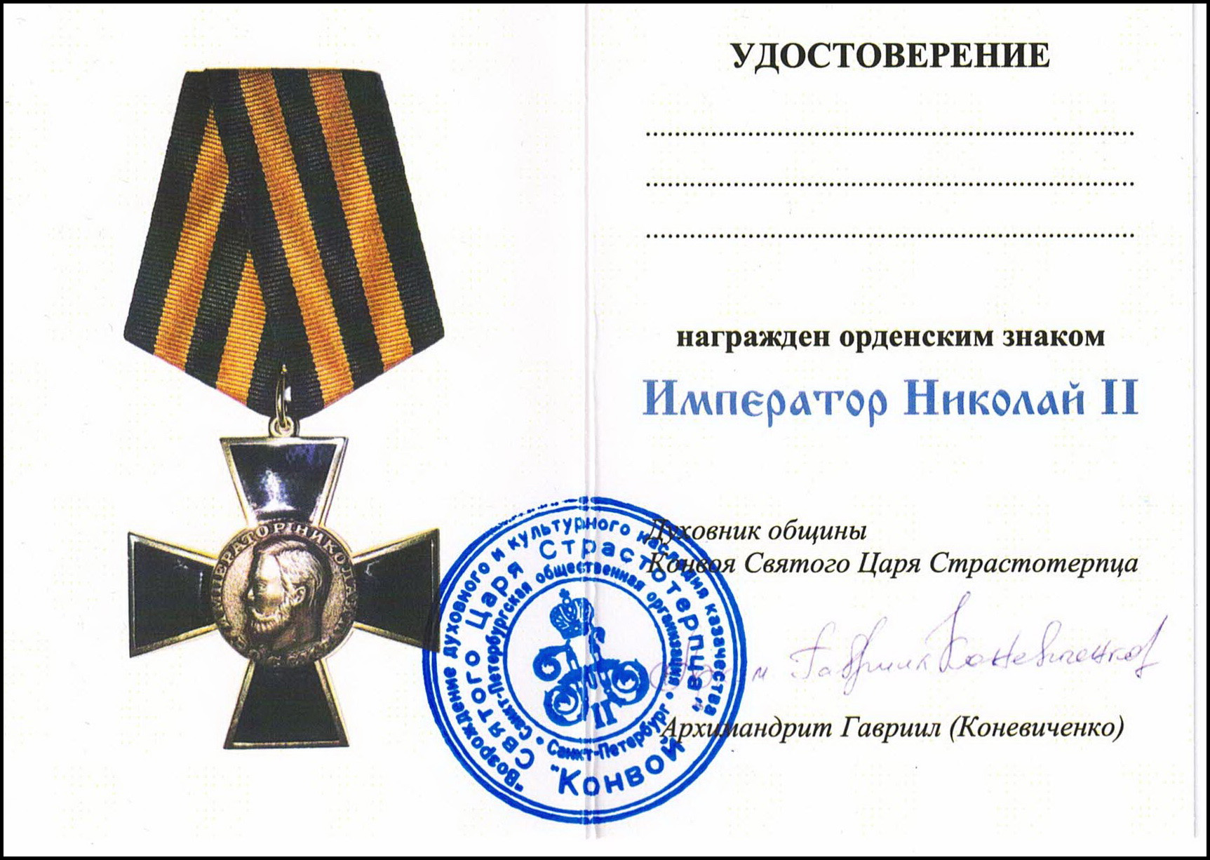 Для меня огромная честь вручить Павлу Викторовичу эту заслуженную награду — орденский знак «Император Николай II». Эта награда вручена по благословению настоятеля храма Тихвинской иконы Божией Матери города Сестрорецка, духовника Конвоя Памяти Государя Императора Николая II архимандрита Гавриила (Коневиченко). Орденский знак «Император Николай II» является символом верности русским традициям, проявленной доблести, личного мужества, подлинной чести и искреннего служения нашей державе.