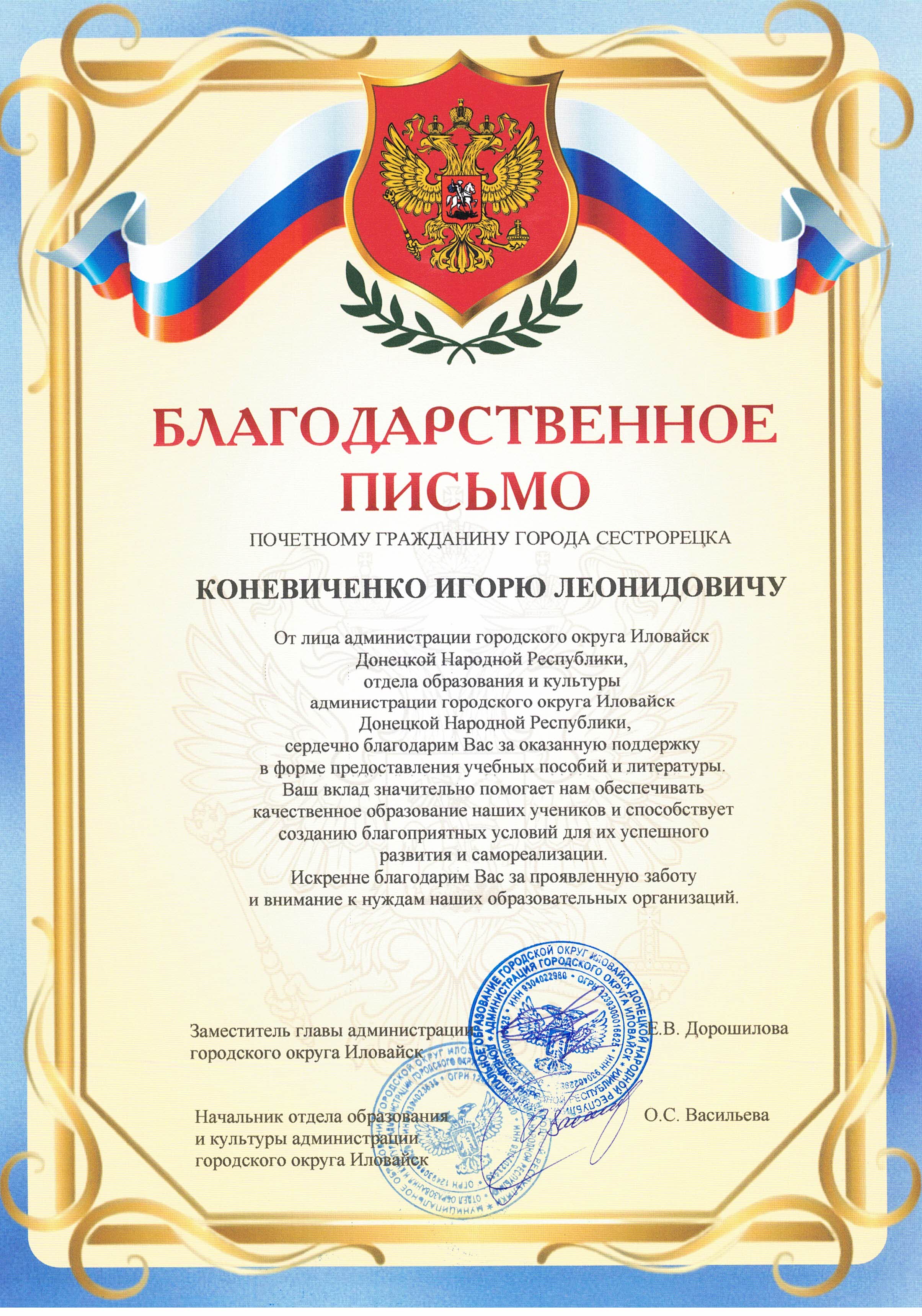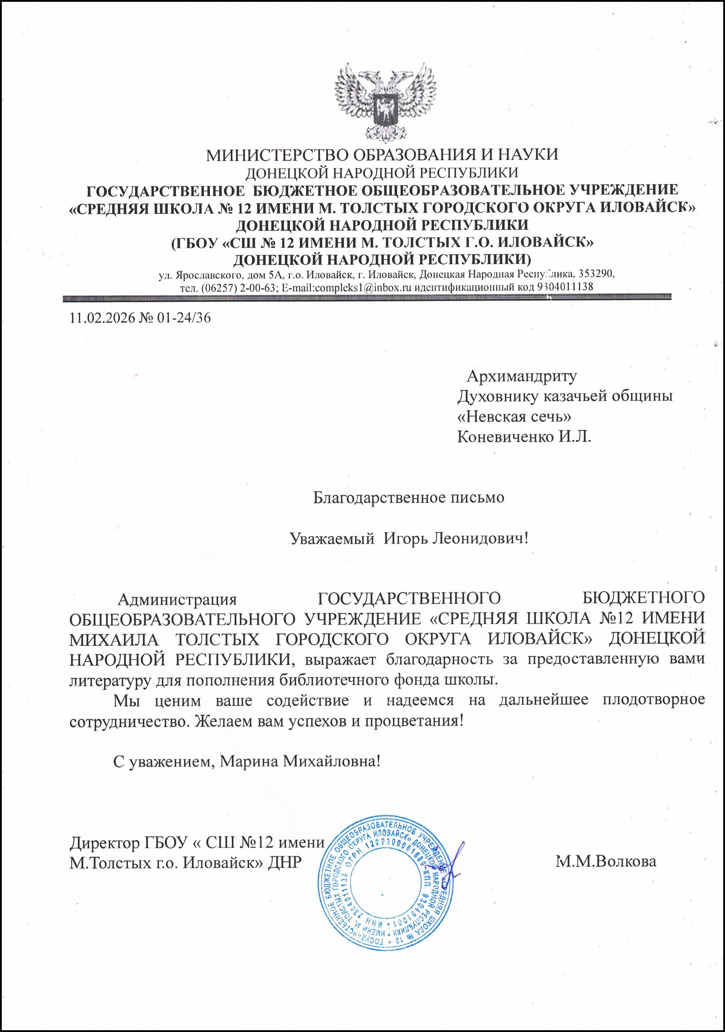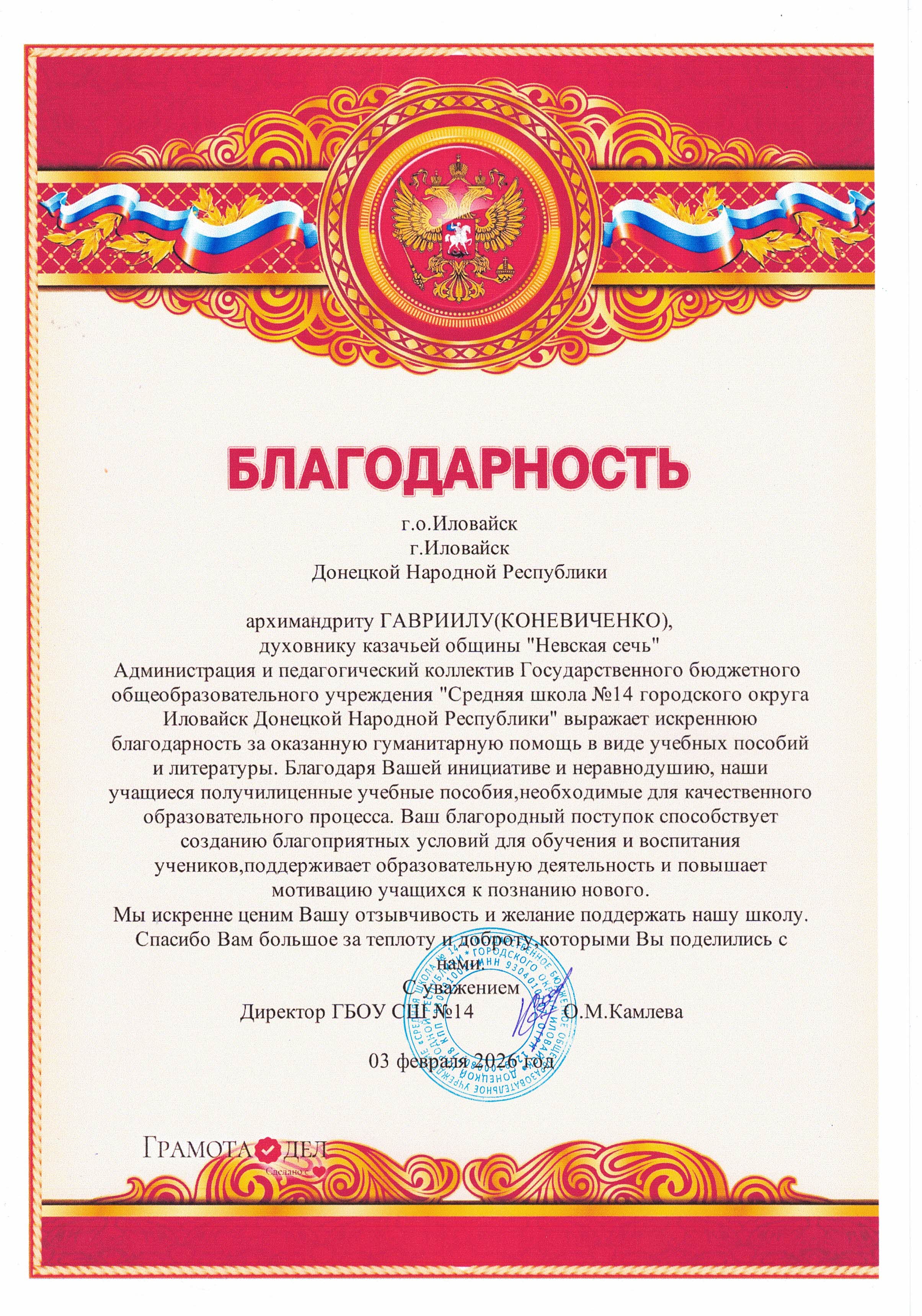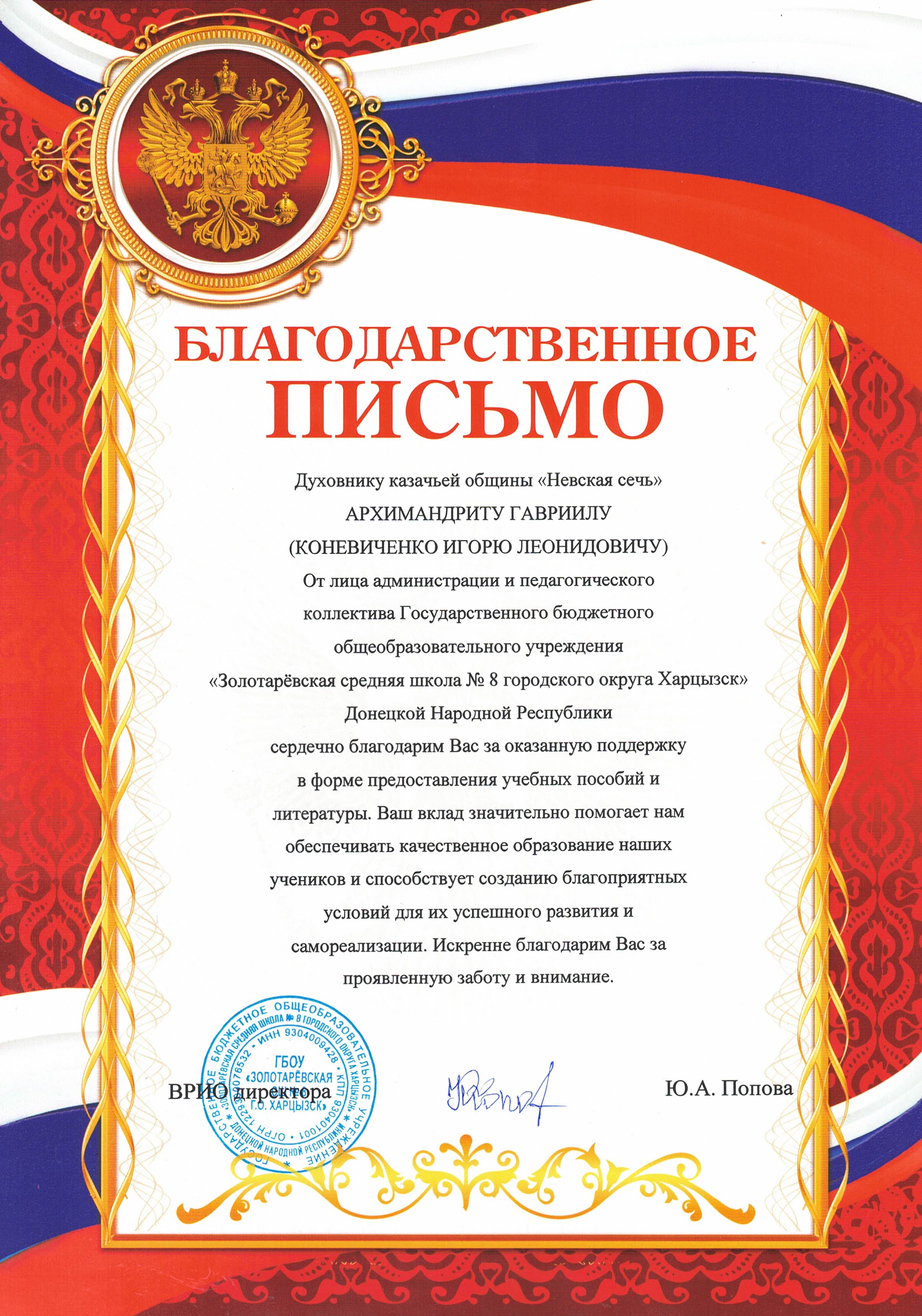 Благодарность духовнику казачьей общины «Невская сечь» архимандриту Гавриилу (Коневиченко) от администрации и педагогических коллективов школ Донецкой Народной Республики