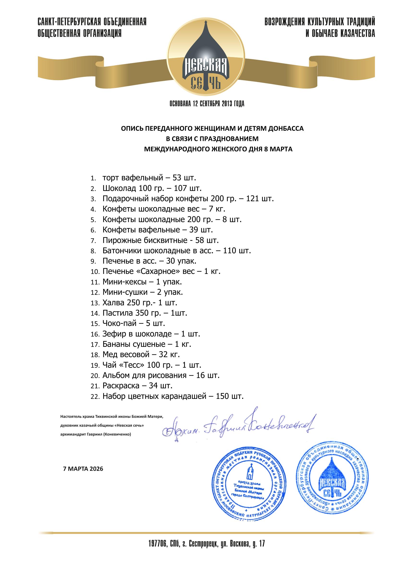 Данная гуманитарная акция проводится совместно казачьей общиной «Невская Сечь», духовником которой является настоятель храма Тихвинской иконы Божией Матери города Сестрорецка архимандрит Гавриил (Коневиченко) и Союзом донбассовцев Санкт-Петербурга и Ленинградской области.