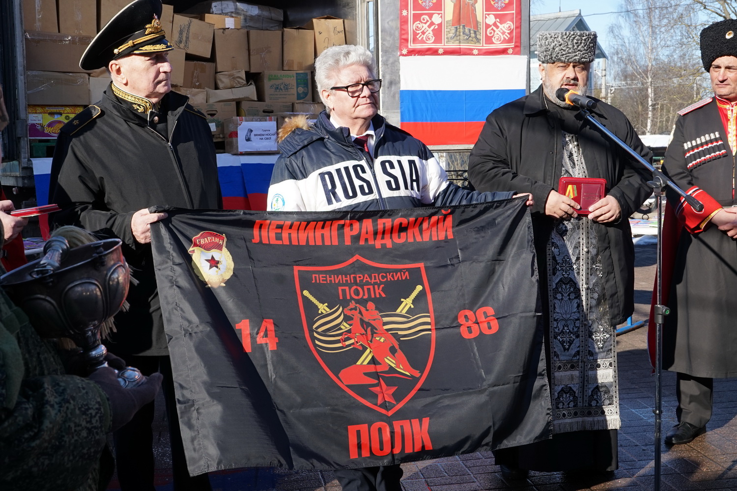 По традиции настоятель храма Тихвинской иконы Божией Матери города Сестрорецка, духовник казачьей общины «Невская сечь» архимандрит Гавриил (Коневиченко) совершил молитву и окропил святой водой гуманитарную помощь и колесницу, которая отправилась в Донецкую Народную Республику.