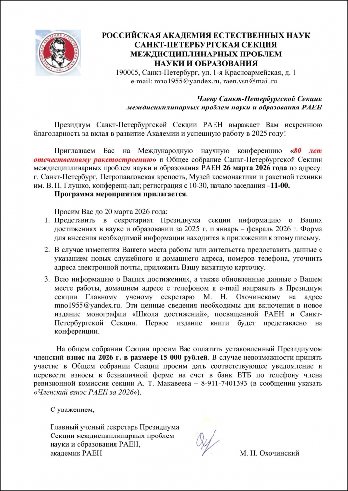 Приглашение на общее собрание Секции РАЕН настоятелю храма Тихвинской иконы Божией Матери города Сестрорецка архимандриту Гавриил (Игорю Леонидовичу Коневиченко), академику РАЕН, д.э.н.