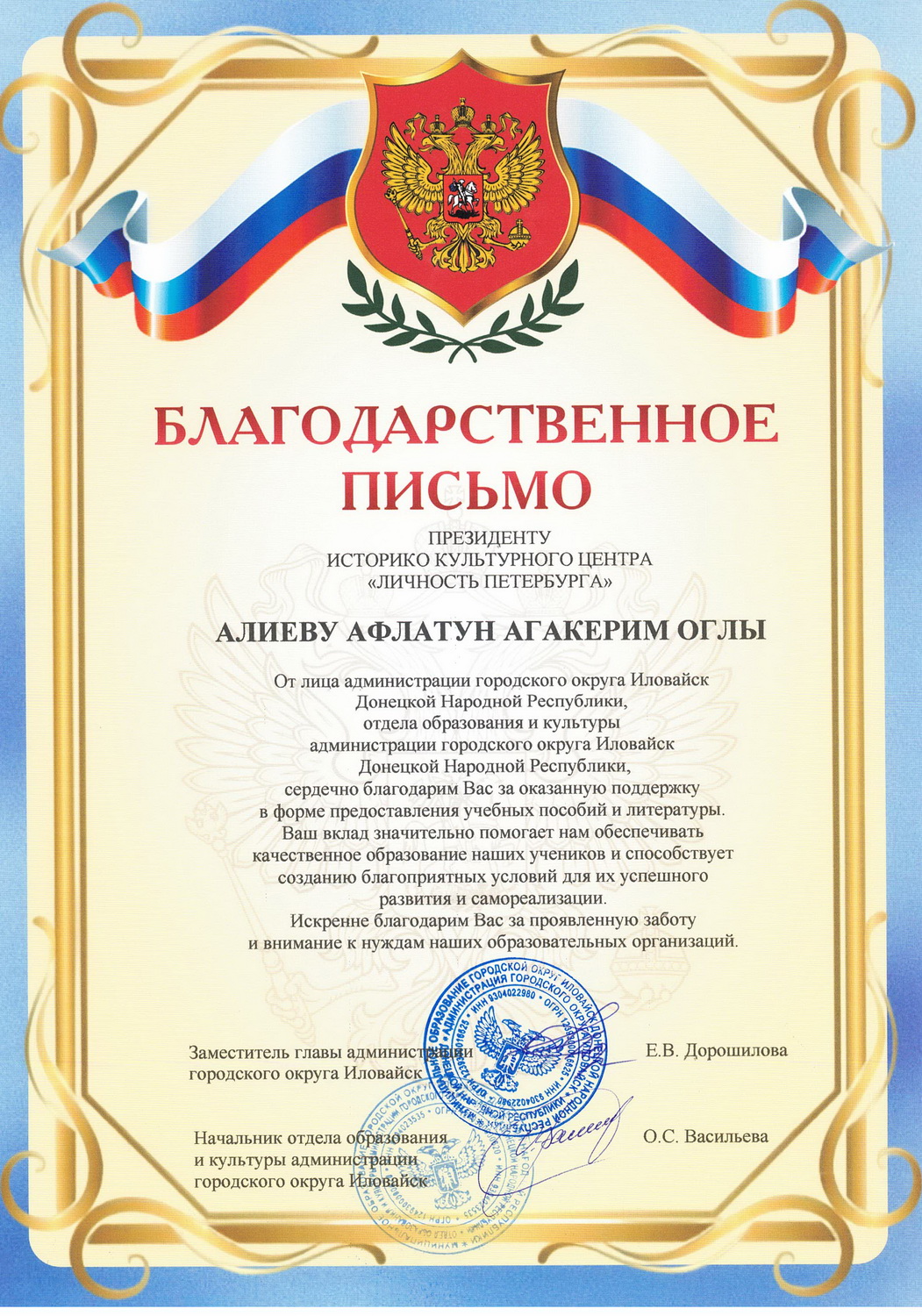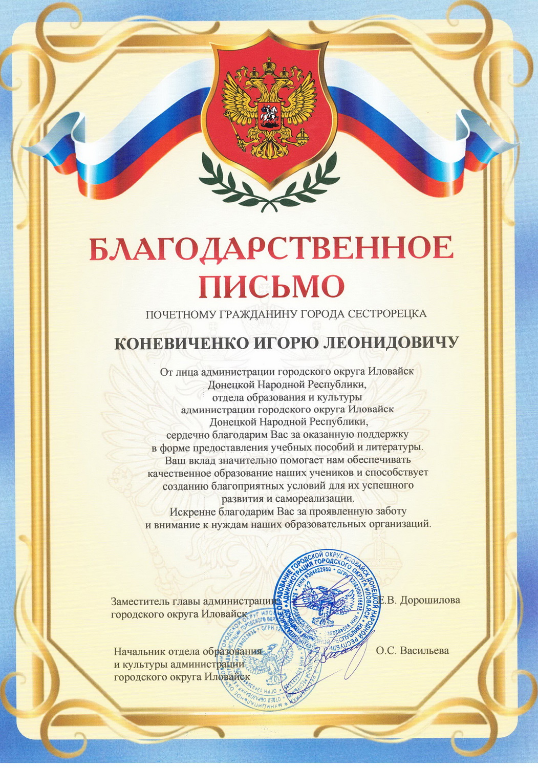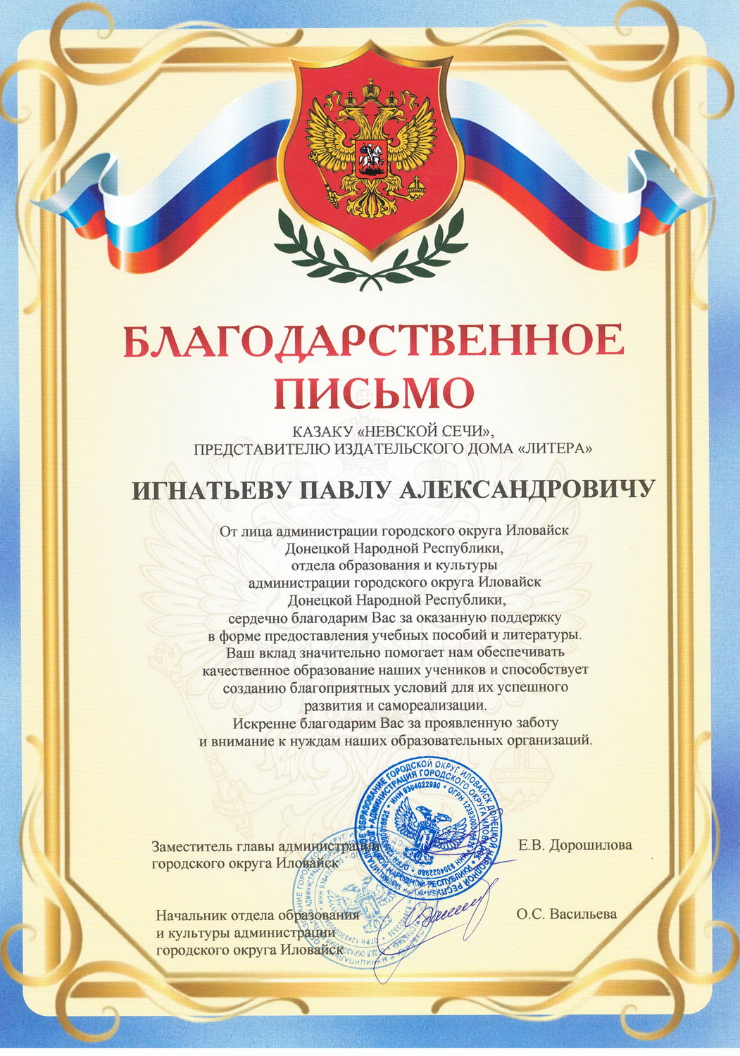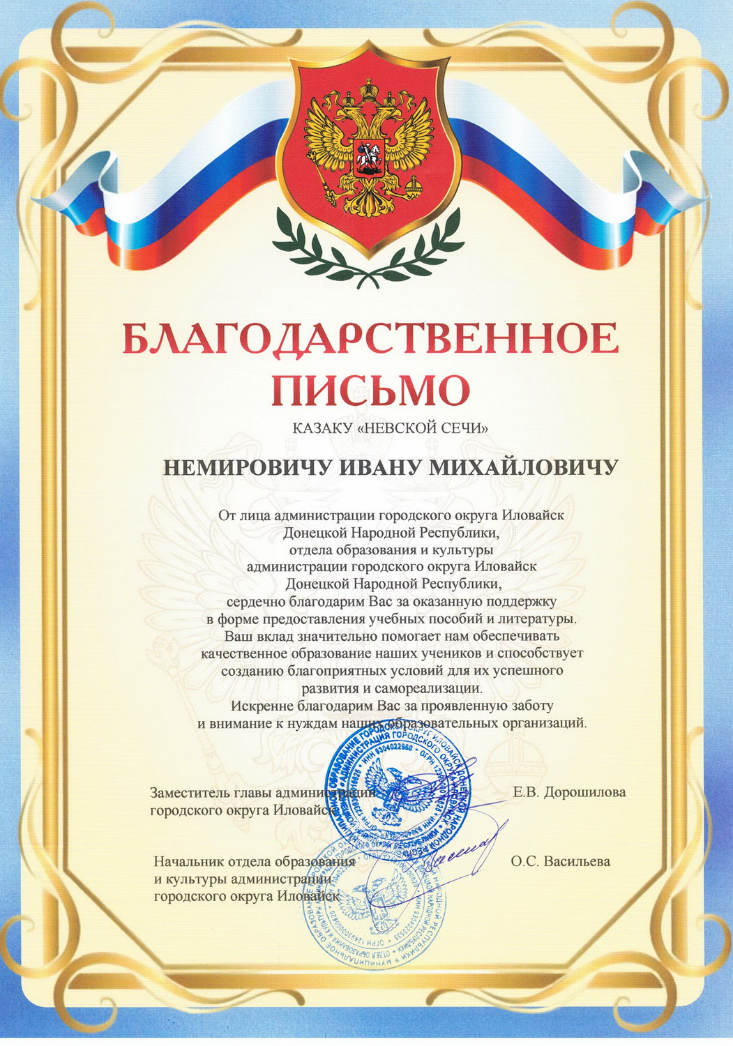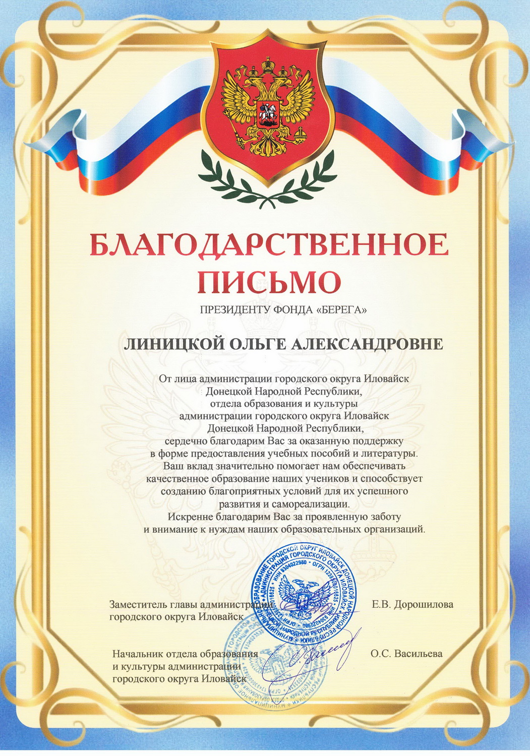 Благодарность участникам гуманитарного конвоя на освобожденные территории в Донецкую Народную Республику от администрации городского округа Иловайск Донецкой Народной Республики