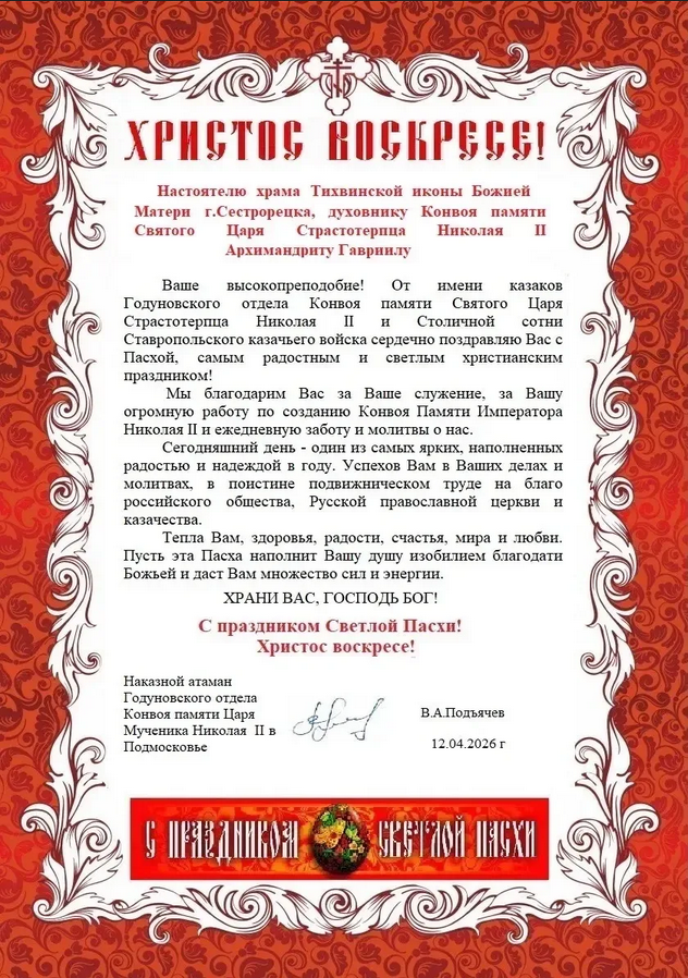 12 апреля 2026 года. Поздравление настоятелю храма Тихвинской иконы Божией Матери Сестрорецка архимандриту Гавриилу (Коневиченко) с Пасхой Христовой от казаков Годуновского отдела Конвоя Памяти Государя Императора Николая II в Подмосковье