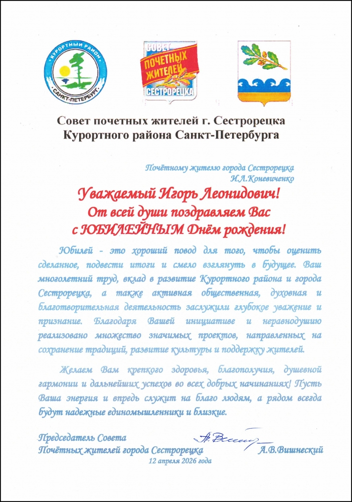 12 апреля 2026 года. Поздравление с Юбилеем – 60-летием Почетному жителю города Сестрорецка Игорю Леонидовичу Коневиченко от Совета Почетных жителей города Сестрорецка